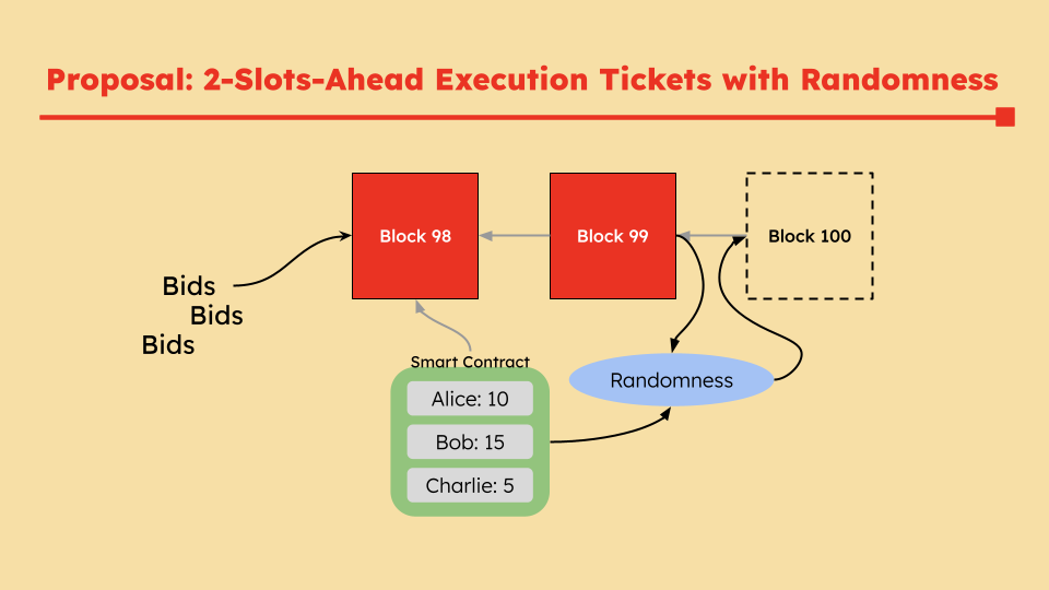 I wouldn’t know how to get this to work in the context of Ethereum though. At first I thought that it would be possible to use an encrypted mempool and then generate randomness based on e.g. the hash of the post-state root given that transactions are encrypted after block 99 in the image. Together with @b-wagn I explored encrypted mempools but they do not have a clear solution either.