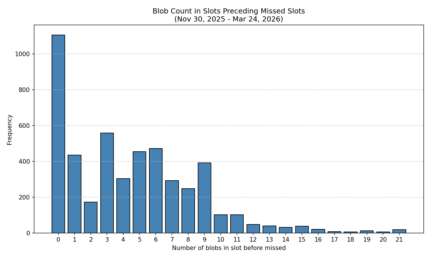 The dataset for high blob counts (16+) remains limited, with sample sizes ranging from 165 to 259 slots per blob count, compared to tens of thousands for lower counts. However, the consistent pattern of elevated miss rates across all high blob counts (16-21) is concerning. Even with limited samples, the trend is clear: higher blob counts correlate with higher miss rates. If these elevated rates persist or worsen as demand increases, network stability could be seriously compromised.
