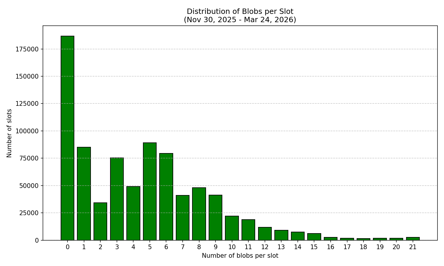 Figure 3: Distribution of blob counts across all observed slots, demonstrating the non-uniform frequency of different blob counts.