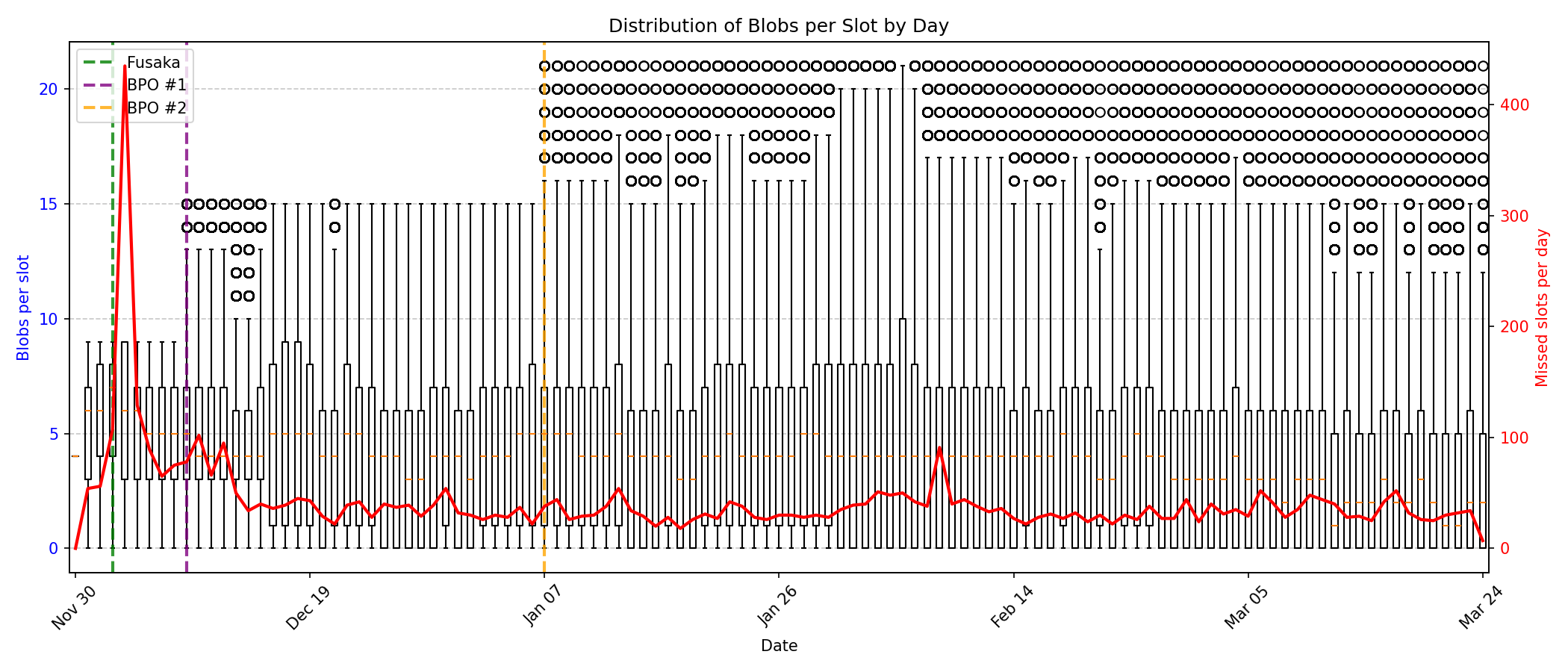 Figure 1: Boxplot showing the daily distribution of blobs per slot (left axis) and the number of missed slots per day (right axis). Vertical dashed lines indicate protocol upgrade events.