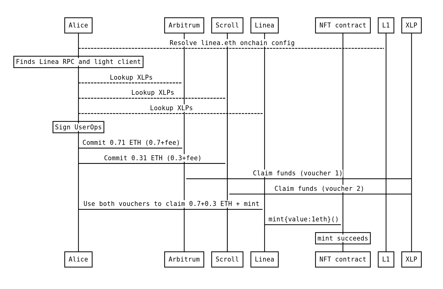 Alice wants to mint an NFT on Linea. It costs 1 ETH. She never used Linea but has 0.8 ETH on Arbitrum and 0.5 ETH on Scroll. She clicks the “mint” button and signs a single transaction. Her wallet figures everything out, transparently transfers enough ETH from Arbitrum and Scroll, mints the NFT on Linea and verifies that she received it.