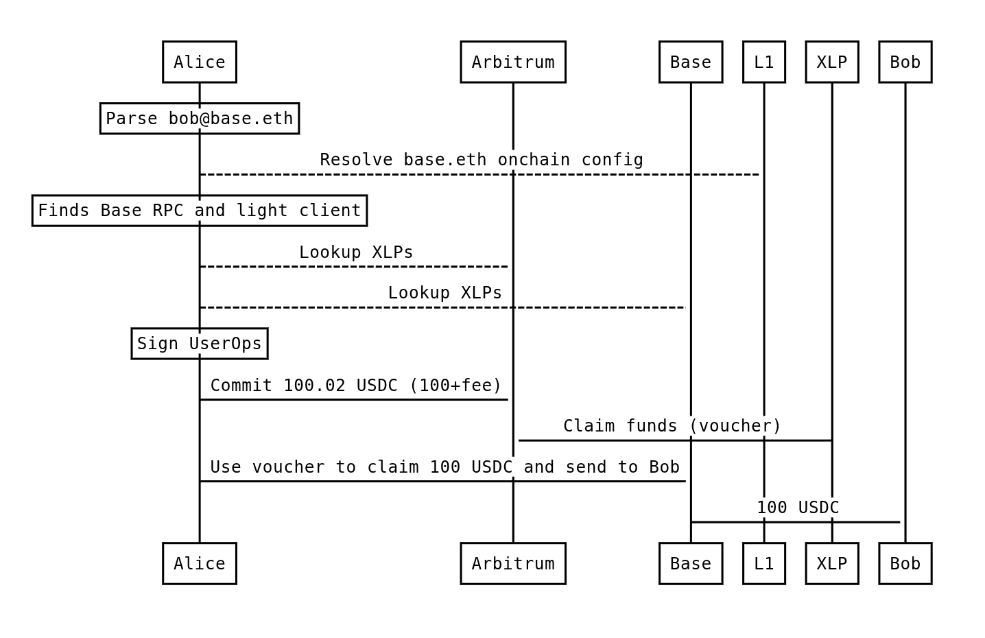Arbitrum Alice wants to send 100 USDC to Base Bob. Alice pastes Bob’s address into her wallet and sends 100 USDC, her wallet figures everything out and Bob receives the funds within seconds.