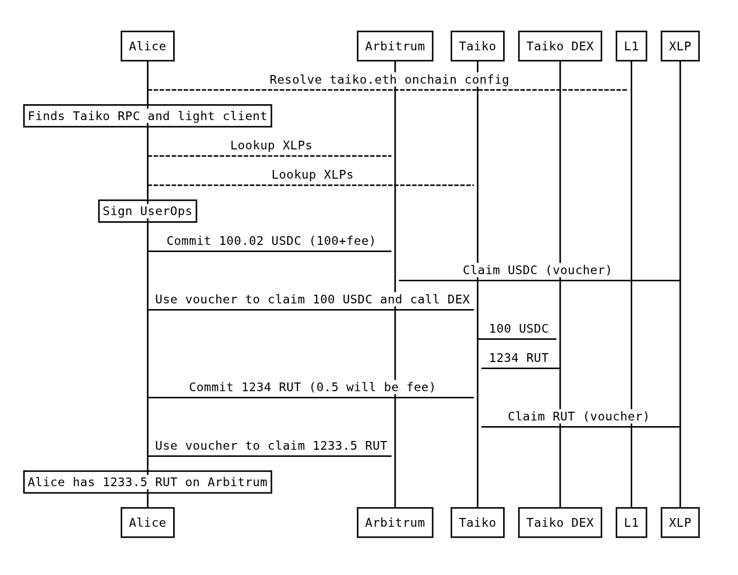 Arbitrum Alice wants to swap USDC to RUT (Rarely Used Token). It has little liquidity on Arbitrum but she finds a good price in a DEX in Taiko. She signs a single transaction, her wallet figures everything out, swaps on Taiko, and she receives the RUT back on Arbitrum within seconds.