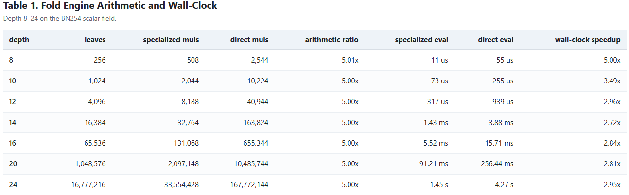 Every entry in the specialized muls column equals exactly 2N - 4, confirming the theoretical count. The multiplication ratio converges to 5.00× across all tested depths, matching the asymptotic prediction (m_{F,\text{pub}} + m_{E,\text{pub}})/4. Wall-clock speedups range from 2.72× to 5.00×; the gap from the arithmetic ratio reflects memory-hierarchy effects at larger N.