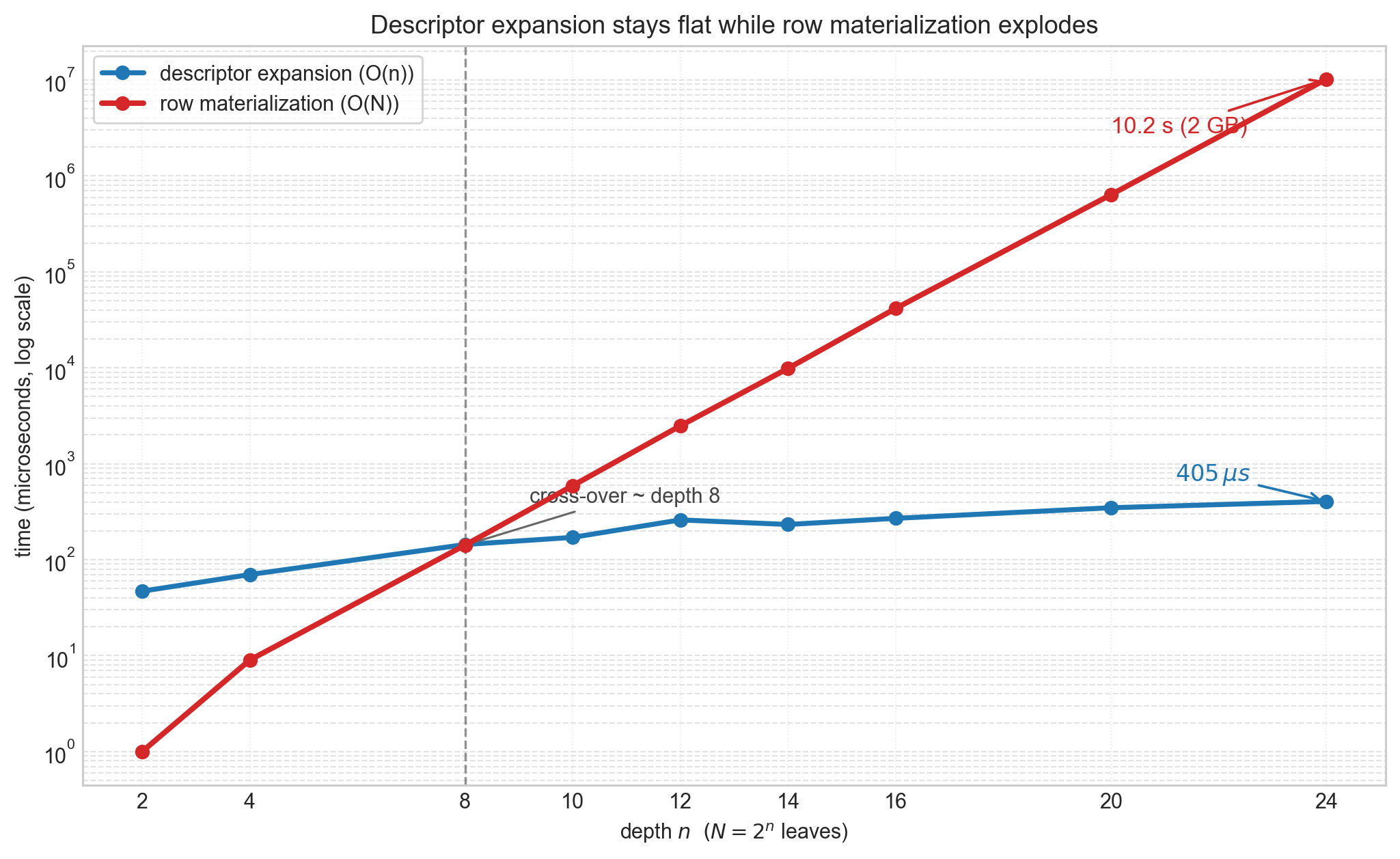 The pattern is clear. Descriptor expansion runs in O(n) time and stays under 500 μs even at depth 24. Row materialization runs in O(N) time: at depth 20, it already takes 637 ms and produces 128 MB of payload; at depth 24, it takes 10.2 seconds and produces 2 GB.