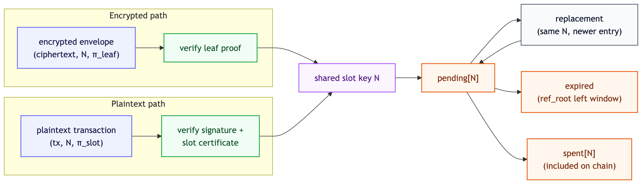- and a shared nullifier namespace that tracks nonce-slot consumption across both encrypted and plaintext transactions.