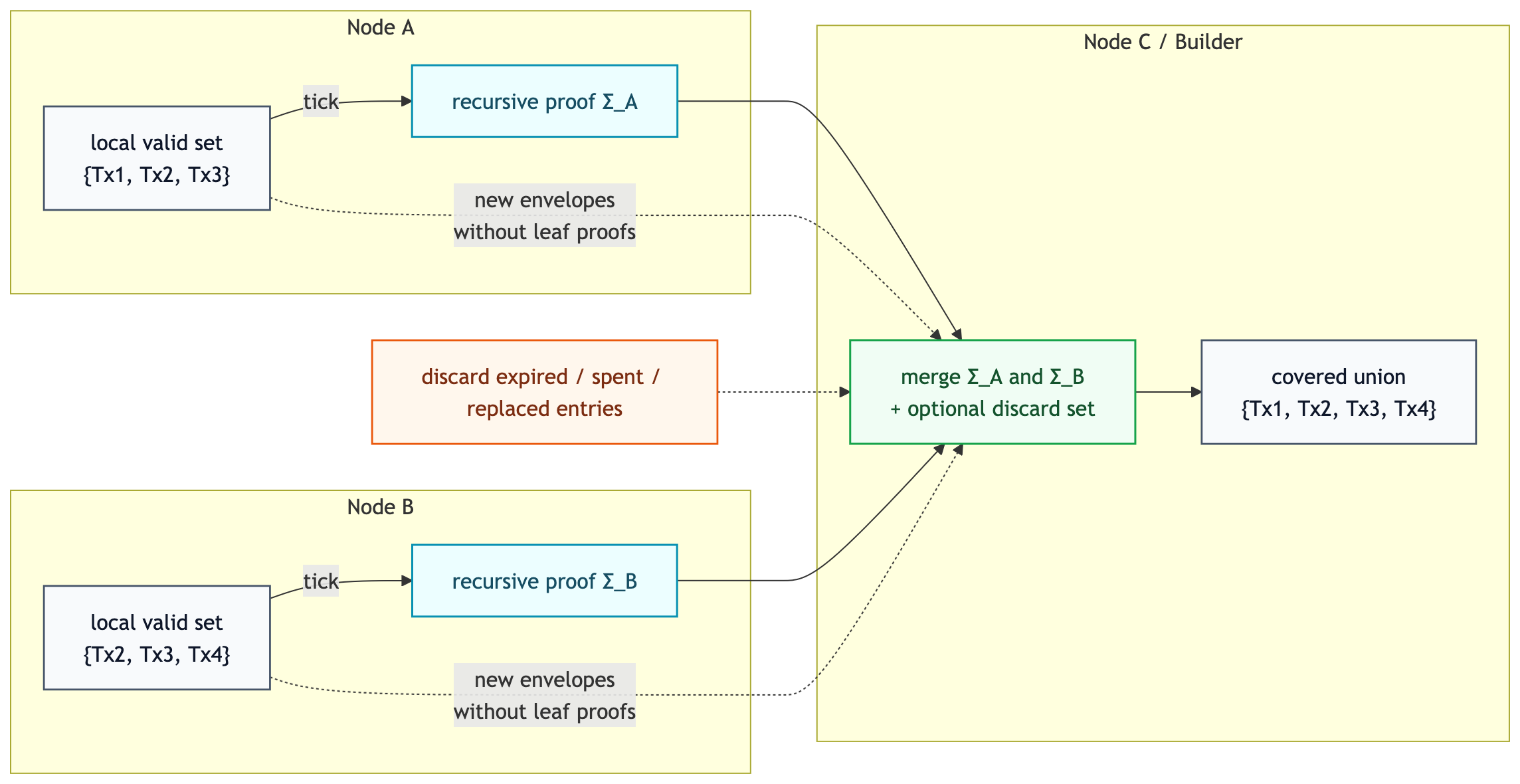 If one node currently has {Tx1, Tx2, Tx3} and another has {Tx2, Tx3, Tx4}, their recursive proofs can be merged into a larger proof covering the union {Tx1, Tx2, Tx3, Tx4}. A builder that receives multiple partially overlapping aggregates can combine them in exactly the same way.