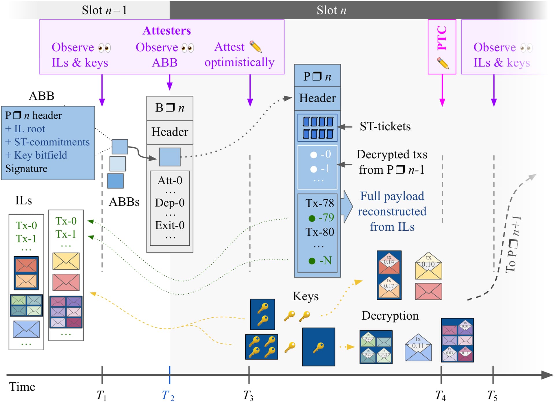 - After T_3 (Payload reconstruction) – Each client resolves the IL transaction references against its local cache of ILs as well as ST-commitments and assembles the full payload. It computes and verifies the payload root and proceeds to execute the payload. The STs selected by the included ABB for next-slot decryption are represented in the execution payload by a list of ST tickets, which are charged according to their full specified