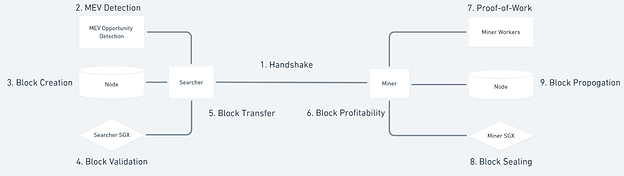 MEV-SGX changes the process by which blocks are produced, validated, and propagated to the network. The block production process is as follows: