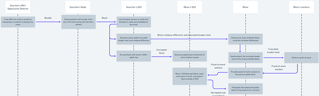 - Block Creation: Searchers use their node to generate a block including their MEV-extracting transactions. They also generate the block witness and input both the block and the witness into their SGX.
