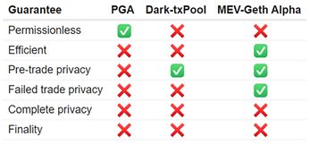 There are a few different proposals for completely private and permissionless MEV auctions. In this section we will briefly review each as well as their associated tradeoffs. Some further discussion can be found in our #MEV-Research Discord channel as well as the âPrivacy Solutions for MEV Minimizationâ roast.