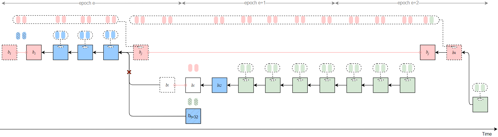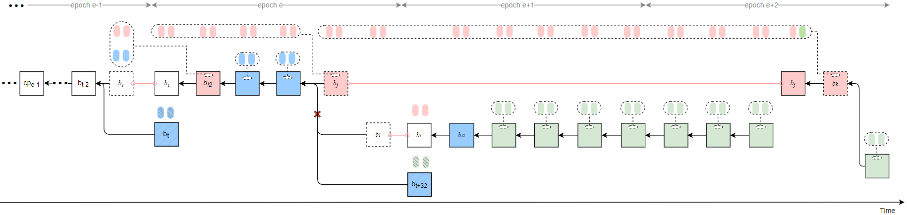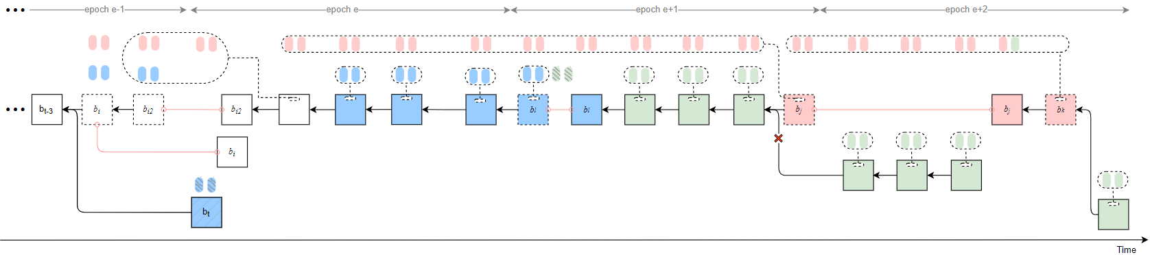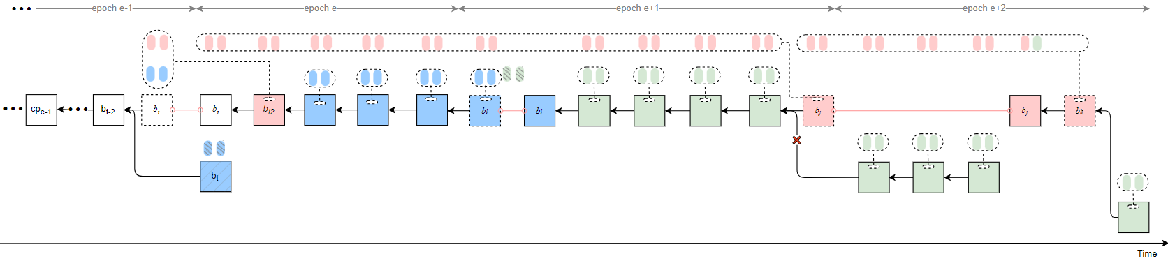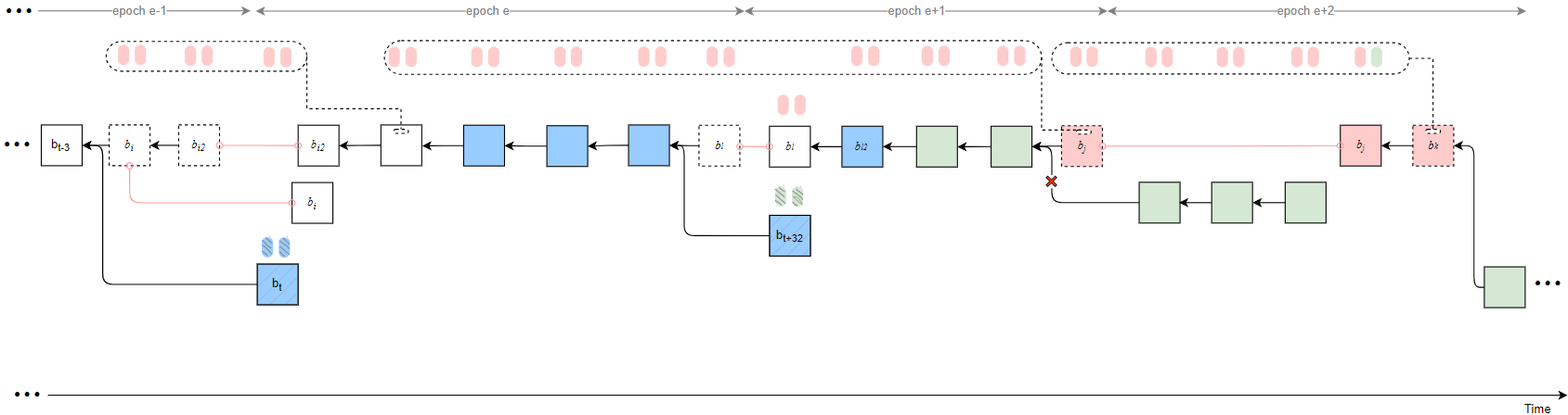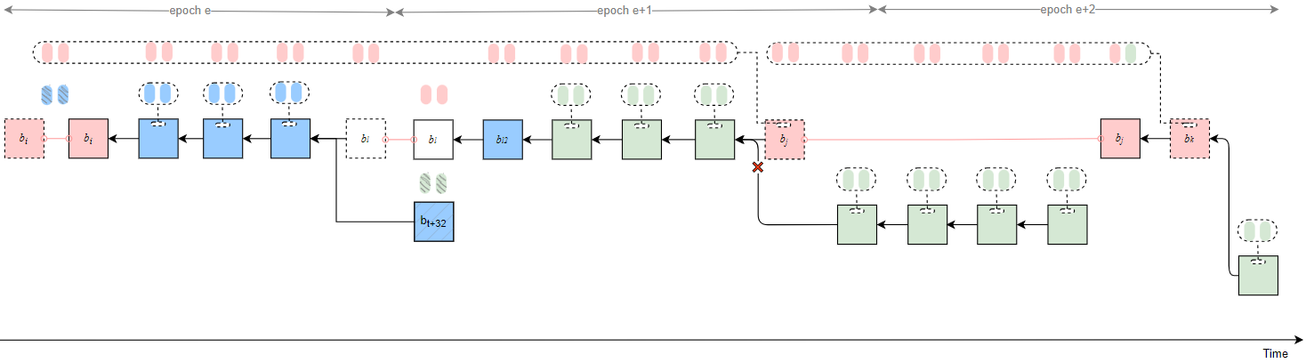 - If t_k in epoch e+3 = 30, then t_{rel} in epoch e+3 can be 13, meaning that b_k proposed in epoch e+2 is released at slot 13 in epoch e+3, and the justified checkpoint is updated to cp_{e+2}.