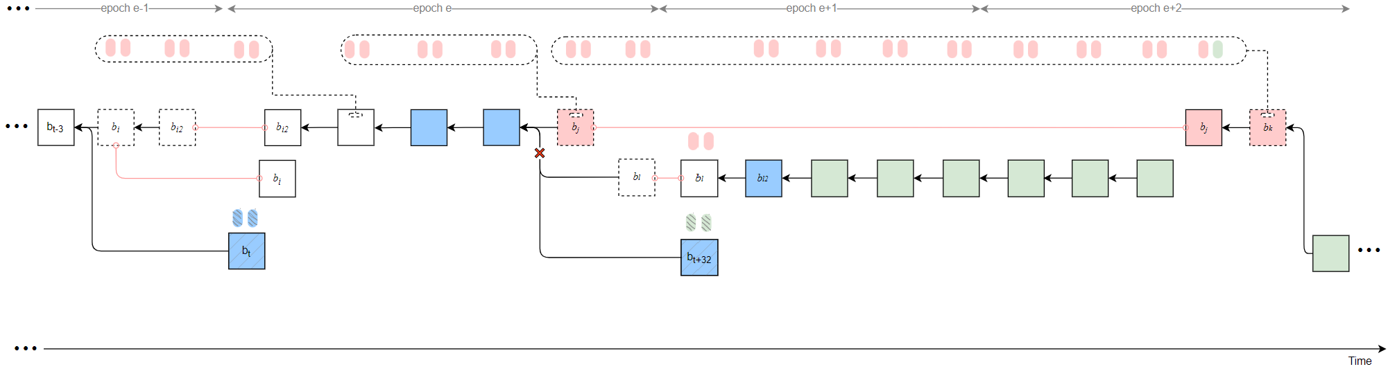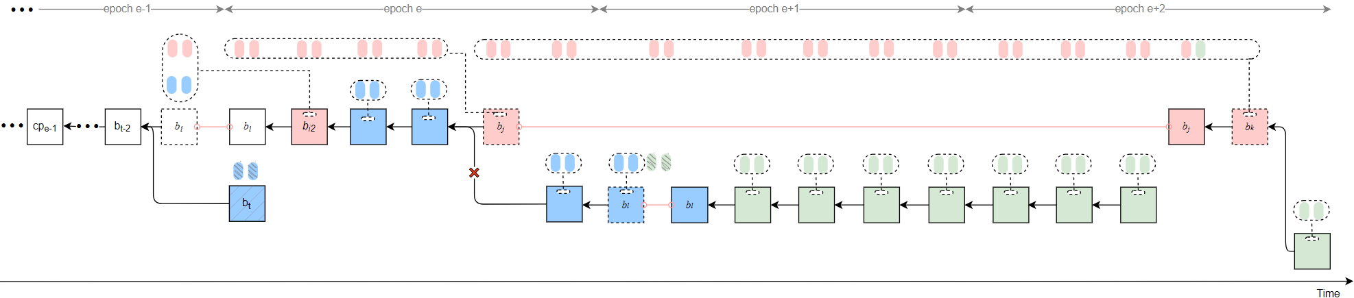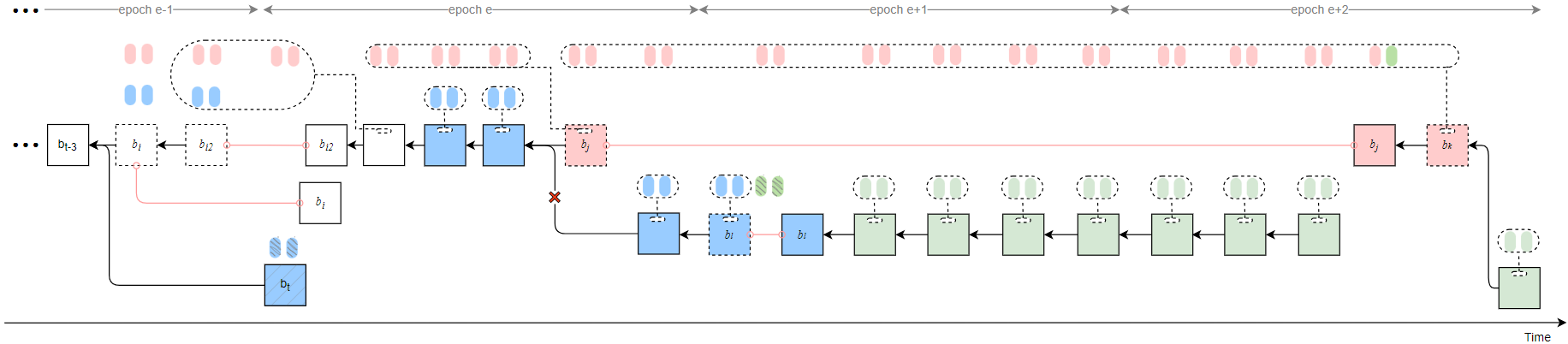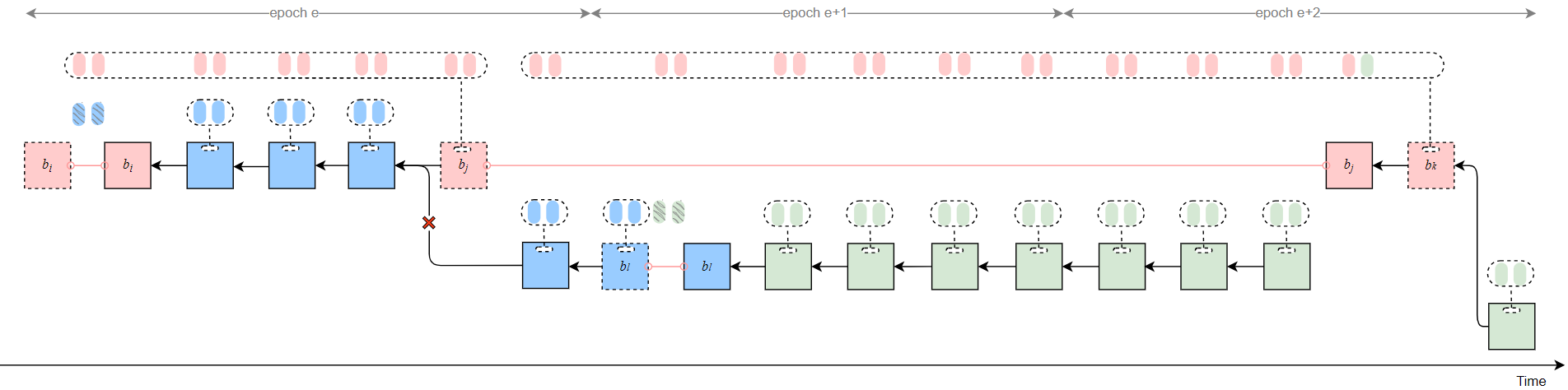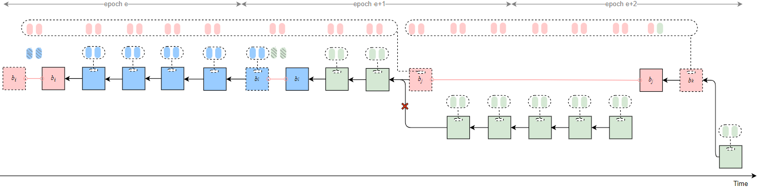 As a result, honest validators fail to justify any checkpoint in epochs e and e+1, while b_j can justify b_{i2} after t_{rel}. Therefore, the honest branch after t_j is pruned (indicated by red crosses in the figure). Attestations included in the honest branch are discarded.