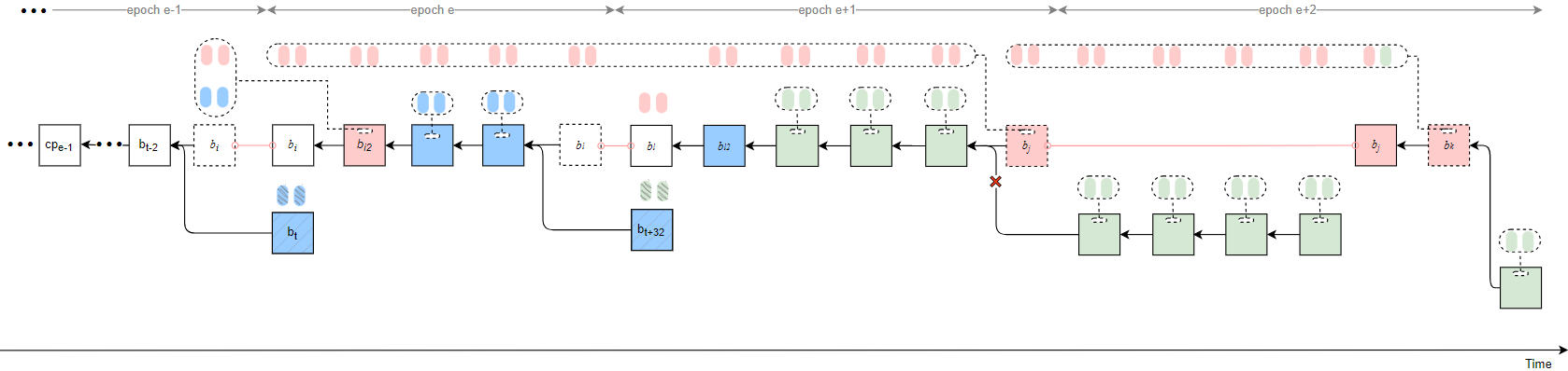 - If t_k in epoch e+7 = 30, then t_{rel} in epoch e+7 can be 13, meaning that b_k proposed in epoch e+5 is released at slot 13 in epoch e+7, and the justified checkpoint is updated to cp_{e+5}.