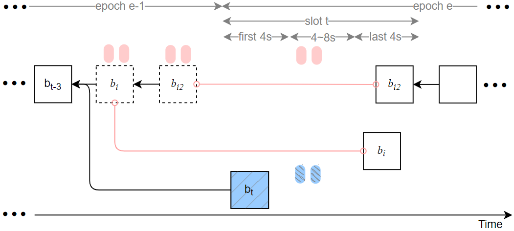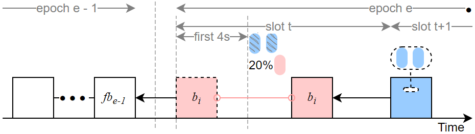 - A Byzantine proposer v_i proposes a block at slot t but withholds its broadcast for 4 seconds, releasing it later within the same slot. Consequently, approximately 1/32 of honest validators cast their votes targeting fb_{e-1} (the finalized-block target from the prior epoch), while other honest attestations target b_i. This split prevents epoch e from being justified.