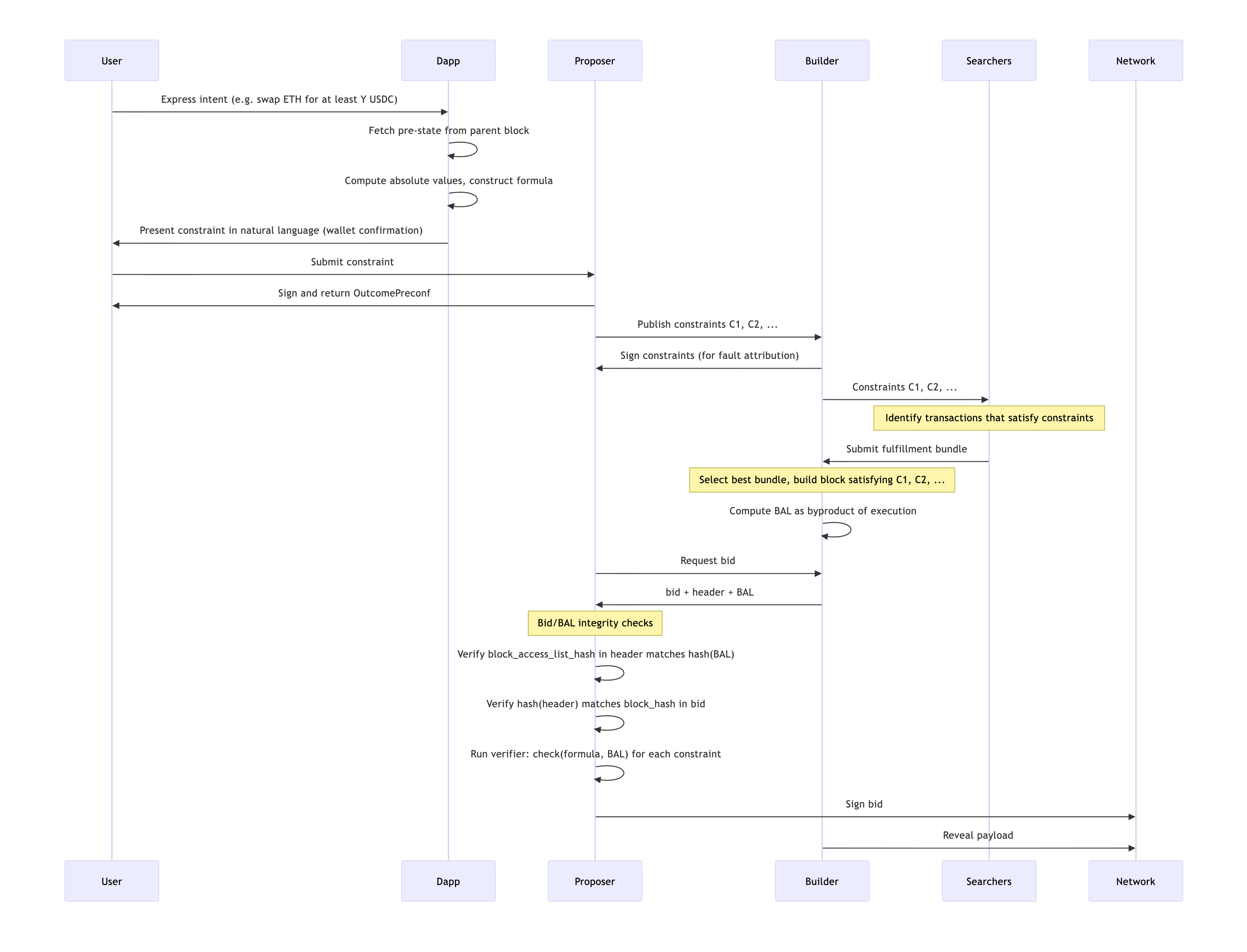 Note, the builder’s signed constraint commitment does not play a role in the on-chain flow. Its purpose is out-of-protocol: a builder that signs constraints and then submits a BAL violating them has produced a cryptographic proof of their own fault, which an external slashing or reputation system can act on.