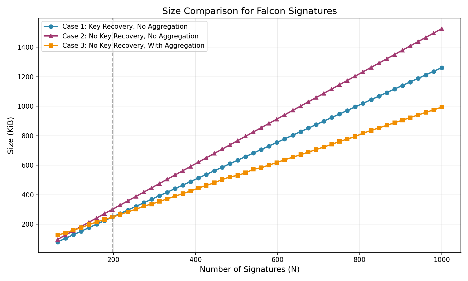 We denote by a_N the aggregated signature size, which depends on the number of aggregated signatures N and includes the salts. Concrete values for a_N can be computed using a script provided alongside prior work on Falcon aggregation (paper). For our analysis, we used a forked version of the repository, which also contains the code used to generate the plots in this document.