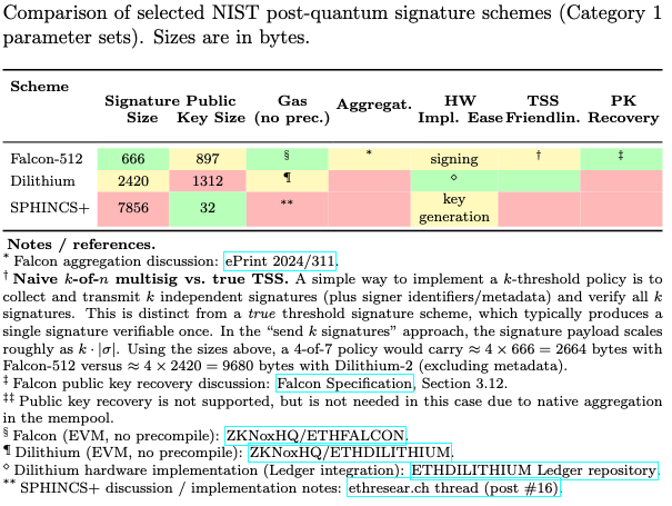 As the figure above highlights, Falcon is especially attractive in this discussion because, among the selected NIST PQ signature schemes, it combines relatively small signature size with comparatively favorable aggregation properties. In particular, Falcon is one of the few practical candidates for which aggregation has been explored in a way that is plausibly relevant to Ethereum-style transaction pipelines.