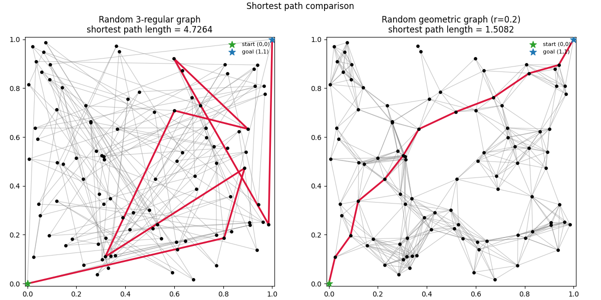 Figure 1. Random graph vs. random geometric graph. Left: a random 3-regular graph. Right: a geometric graph with connection radius r = 0.2. Red edges show the shortest path between two distant nodes; geometric locality reduces path stretch.