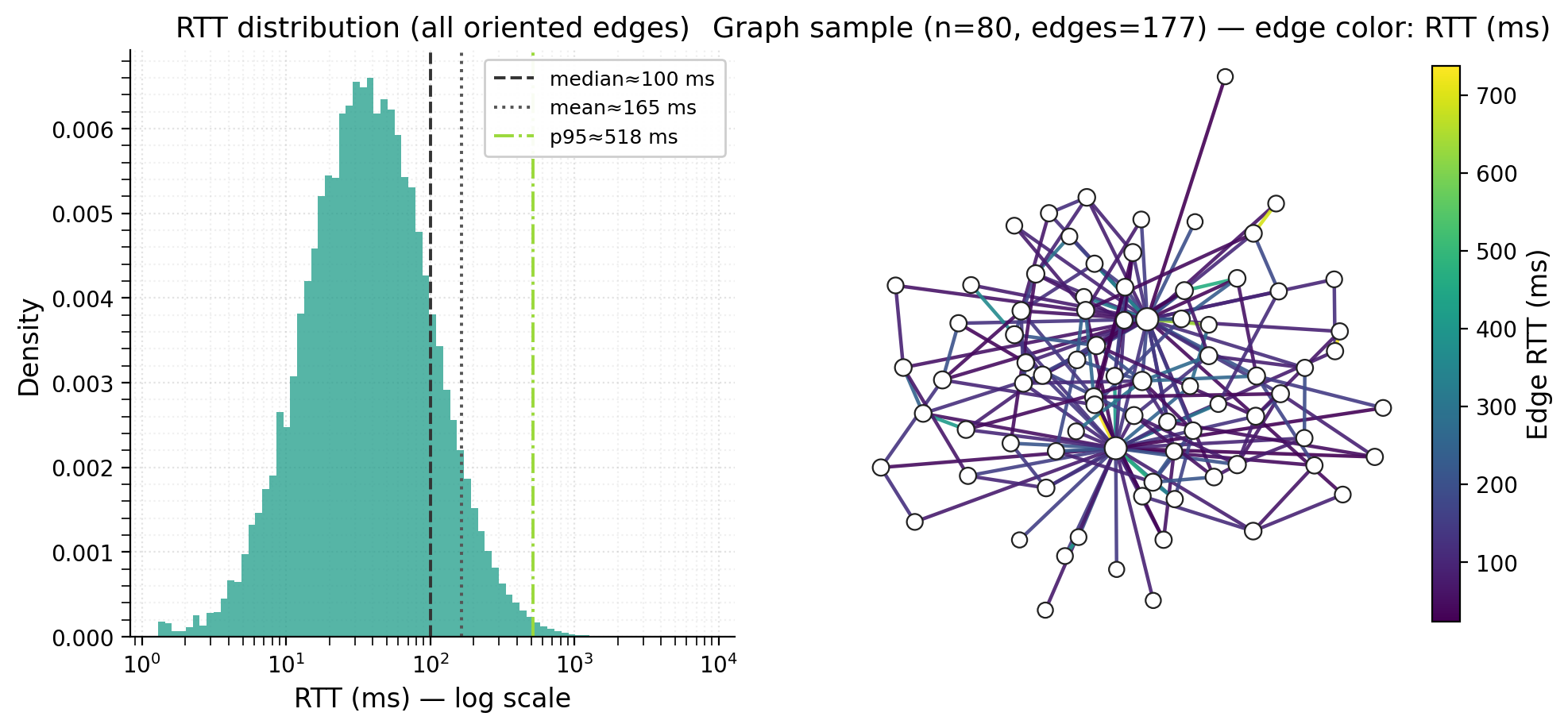 Figure 2. RTT distribution and representative topology. Left: density of oriented edge RTT samples on a log-x axis under the baseline