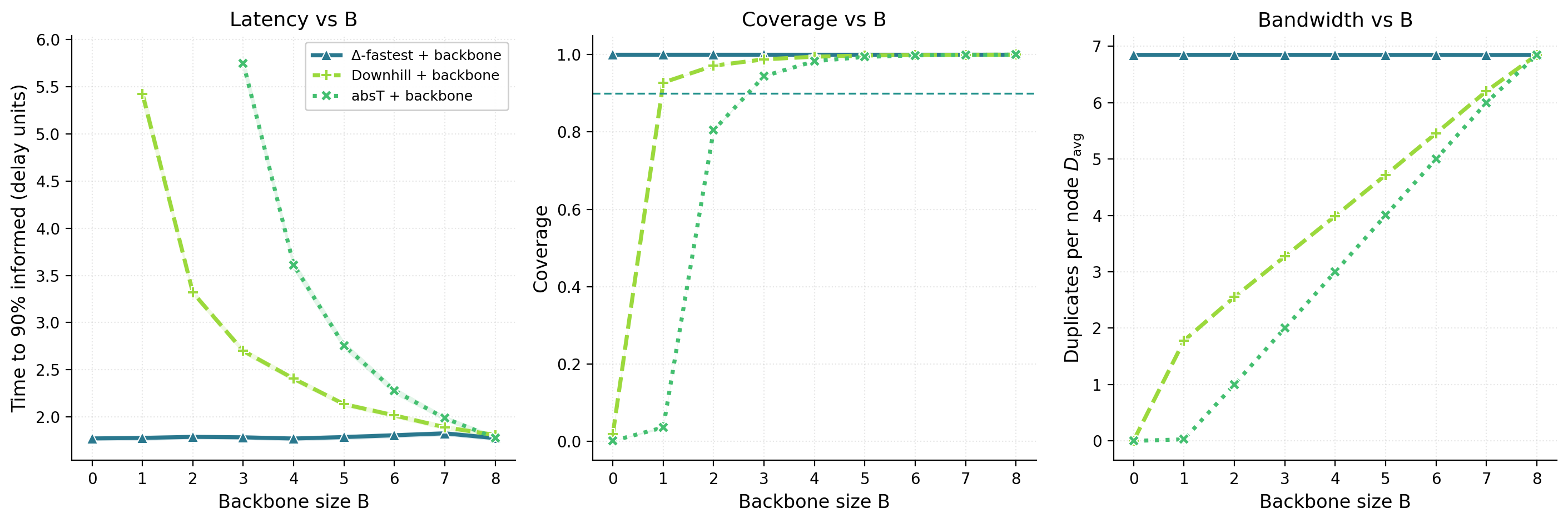 Figure 5. Backbone sensitivity at fixed total budget \Delta=8. Left: t_{90} vs. backbone size B. Middle: coverage vs. B (dashed line marks the 90% floor). Right: D_{\text{avg}} vs. B. Curves: ▲