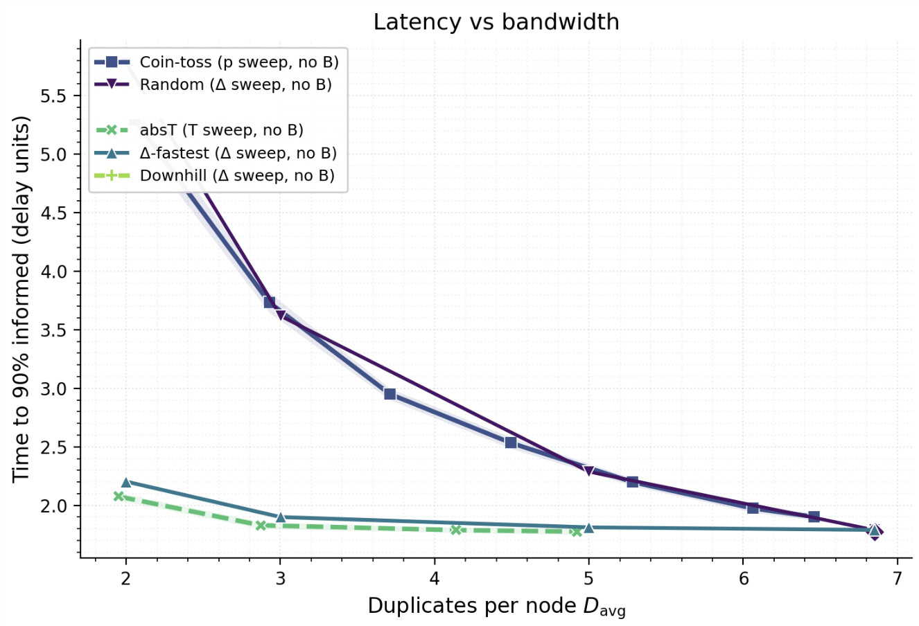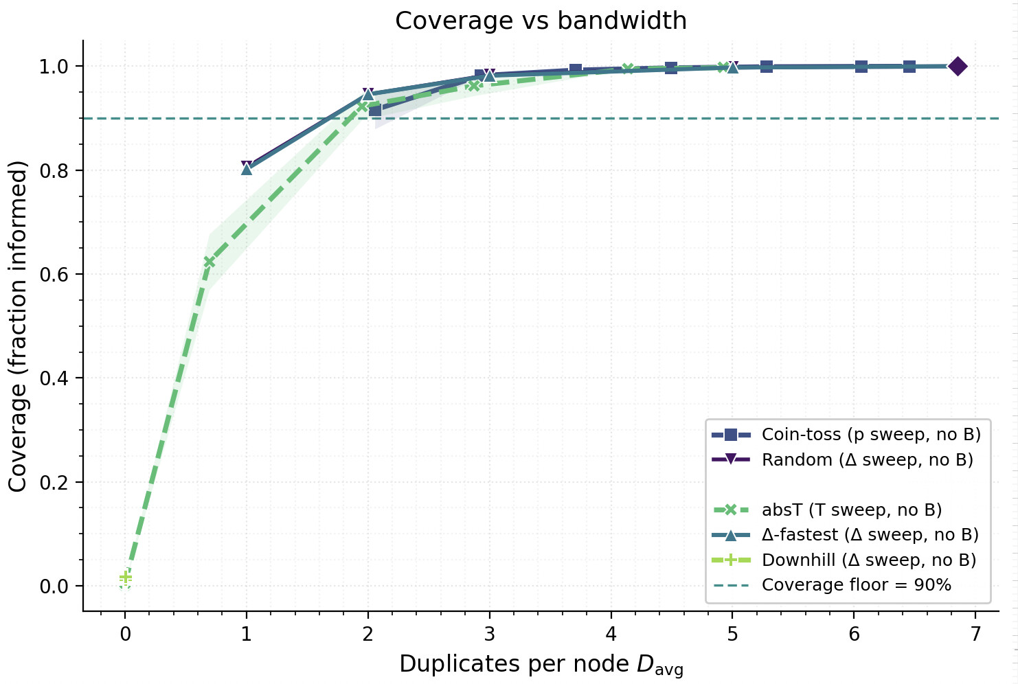 Given our experimental setup, Figure 3 shows that RTT-aware (Δ-fastest, fixed-T) and RTT-agnostic (Random, Coin-toss) rules trace nearly the same coverage–bandwidth frontier once the average duplicates D_{\text{avg}} exceed roughly 3\text{–}4. All four policies climb rapidly to ≥0.95 coverage and then saturate near full reach with overlapping CIs. The exception is Downhill, which can miss the coverage floor at low bandwidth because its relative threshold prunes too many candidates on already-fast nodes.