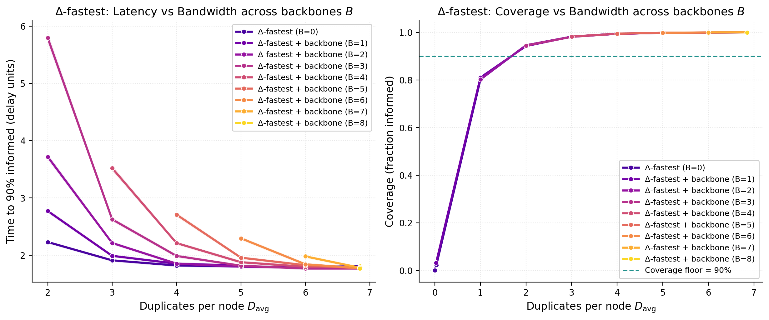 Figure 6. Effect of backbone size on Δ-fastest performance. Left: t_{90} versus average duplicates (D_{\text{avg}}) for Δ-fastest + backbone with varying backbone size B\in{0,1,2,\ldots,8}. Right: coverage versus D_{\text{avg}} for the same configurations; dashed line marks the 90% floor. For each B, the total budget is \Delta_{\text{total}}=B+\Delta_{\text{extra}}, where \Delta_{\text{extra}}\in{0,1,\ldots,5} controls the number of additional fastest neighbors beyond the random backbone. Shaded regions are 95% CIs.