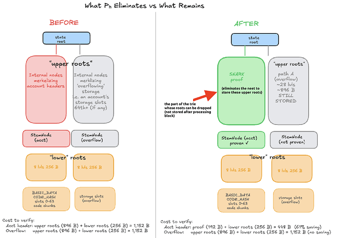 - No Merkle roots are needed for proving balance, nonce, codehash