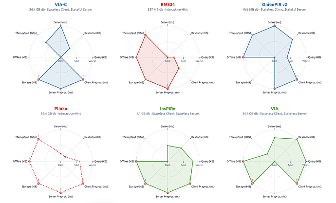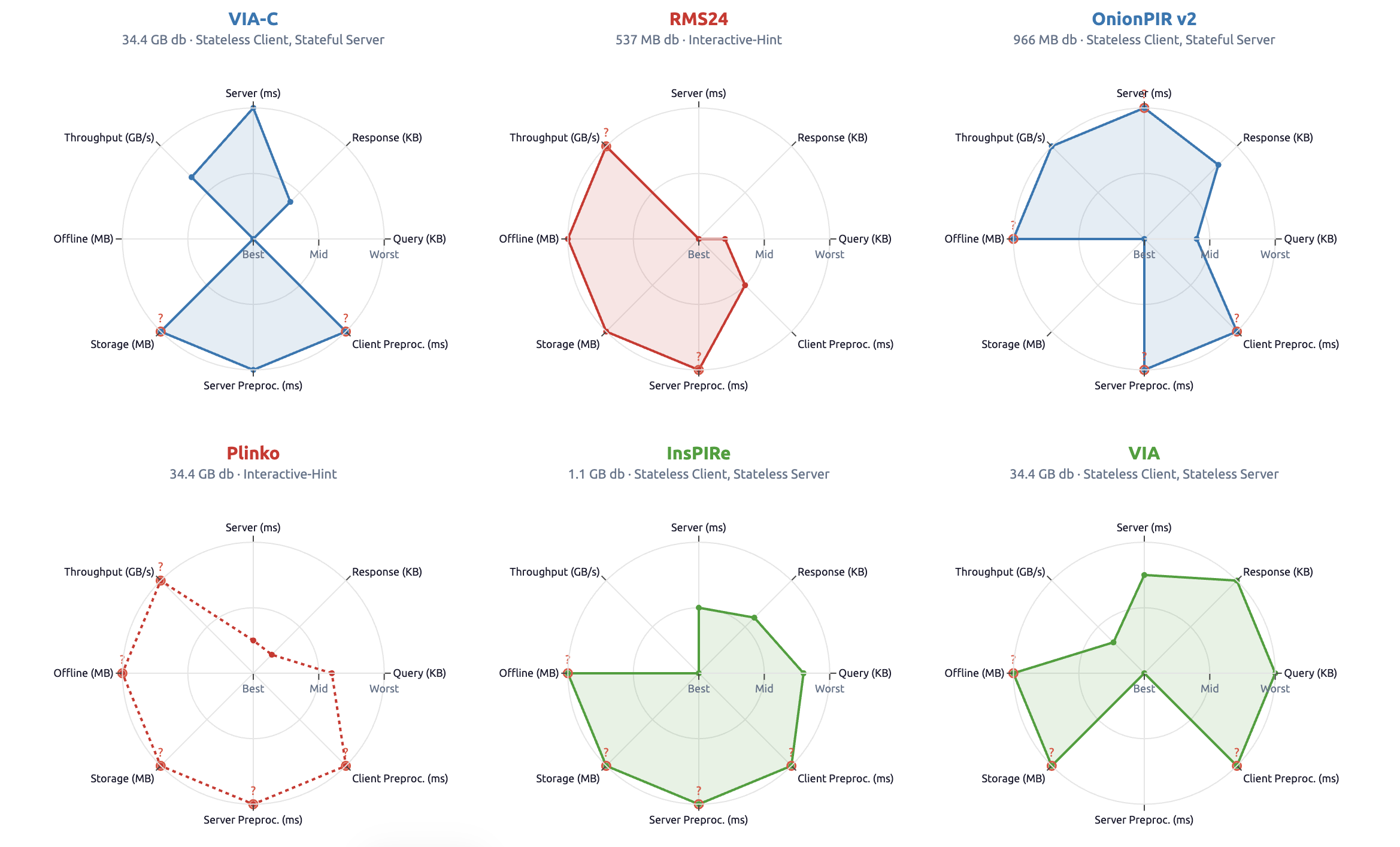 - PIR schemes referenced in this post: SealPIR, MulPIR, Spiral, Respire, HintlessPIR, YPIR, InsPIRe, VIA, VIA-C, SimplePIR, DoublePIR, Piano, RMS24, Plinko