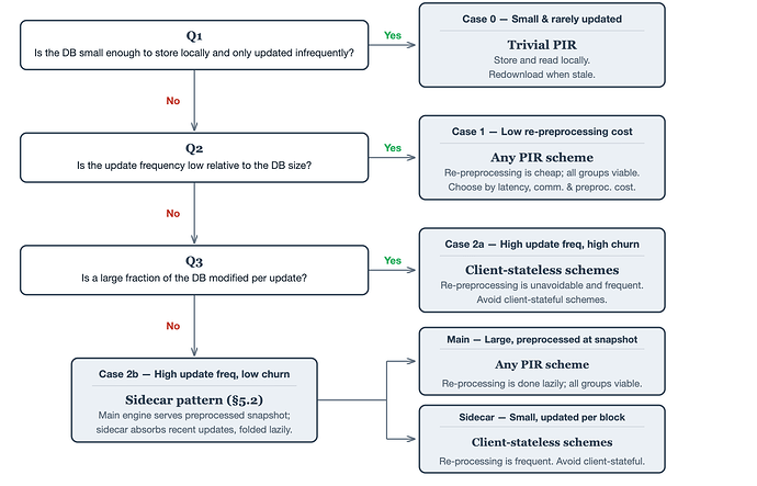 We can get away with having to update the dataset and incur the update cost of some PIR schemes by snapshotting at, say, the 1st day of the year. For example, on January 1st 2026 we take the snapshot of all blocks, do the required preprocessing on that dataset, and never have to update it again. Block data >= Jan 1st (which would be massively smaller than former) is maintained in a dedicated dataset that is update-optimal.