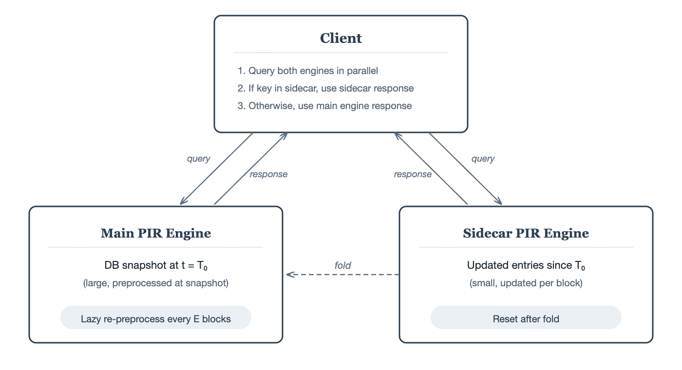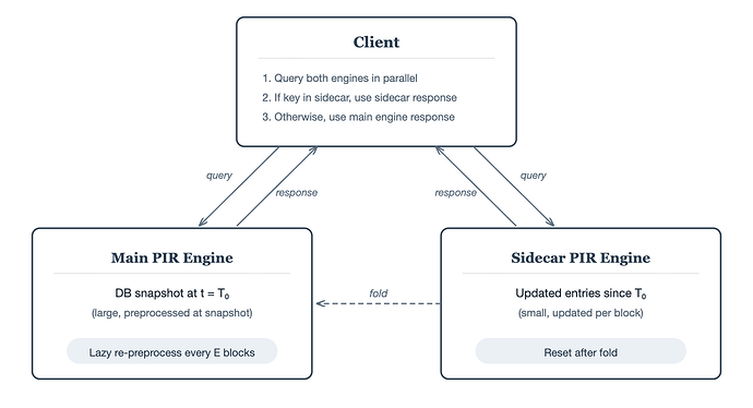 Periodically (lazily — e.g. every E blocks, or when the sidecar grows beyond a threshold), the sidecar’s entries are folded into the main DB and preprocessing is re-run. The sidecar is then reset. The key property: re-preprocessing happens in the background at a relaxed pace, not on the critical path of every update. The sidecar absorbs the real-time update pressure. During the fold, the old main engine continues serving queries while the new preprocessed version is built. Once ready, the client switches over and the sidecar resets to accumulate only entries updated since the new snapshot.