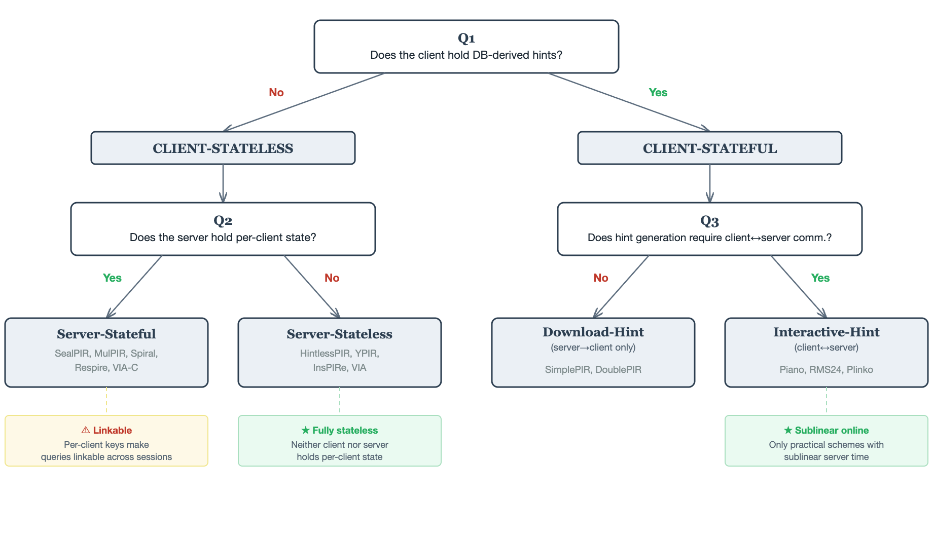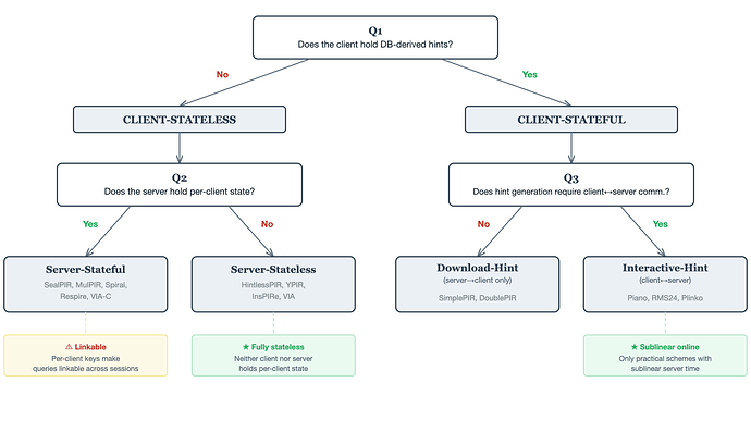 - Server-stateful schemes (e.g., SealPIR, MulPIR, Spiral, Respire, VIA-C) require the server to cache per-client cryptographic material such as FHE evaluation keys. The server’s storage grows with the number of clients, and each query must be matched to the right key — making queries from the same client linkable across sessions even when network-level privacy techniques like onion routing hide the client’s IP. DB preprocessing cost is usually minimal in these schemes (e.g., FHE plaintext encoding only).