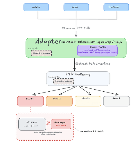 With Ethereum data split into S shards, each shard being served by a PIR engine tailored to its types and access requirements, users query the engine of interest but simultaneously submit decoy queries to all other engines as well. This is equivalent privacy-wise to the user submitting a single query to one monolithic PIR engine serving the entirety of chain data.