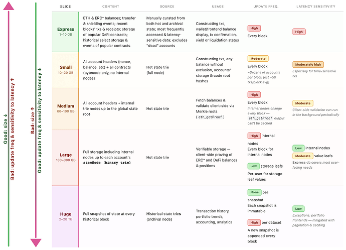 The Medium & Large slice are particularly challenging because they are both large in size and frequently mutated. This can potentially be adapted to by slicing it further “horizontally” per level of the state trie (see Section 8.1)