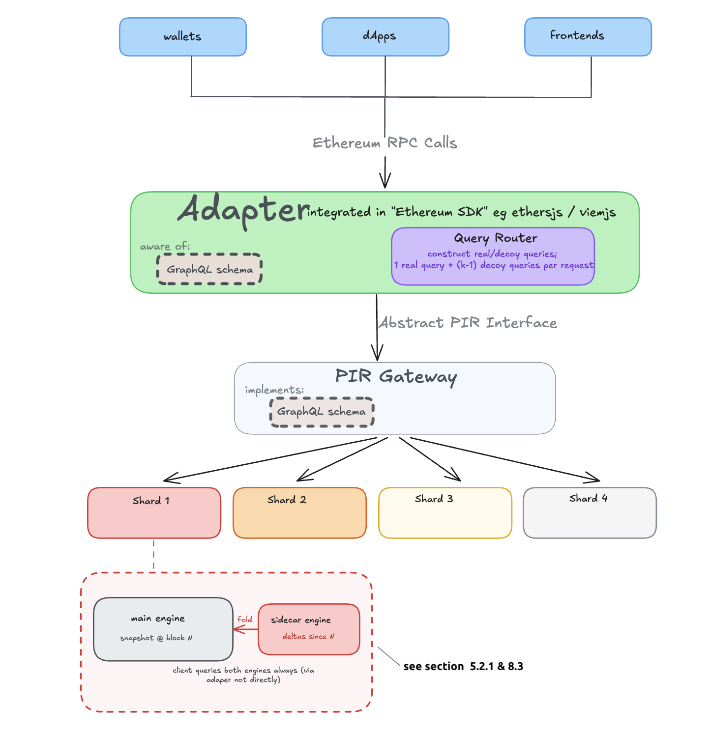 getProof, then querying the non-masked data “doxes” the other queries to masked data, jeopardizing the whole thing. So the privacy of all user queries must be preserved. - Backward compatibility with Ethereum RPC: querying of PIR engines is abstracted from users who continue to query the Ethereum state using Ethereum RPC spec as is now. Similarly for Ethereum nodes, they answer RPC calls from sync’ing PIR engines without modification.