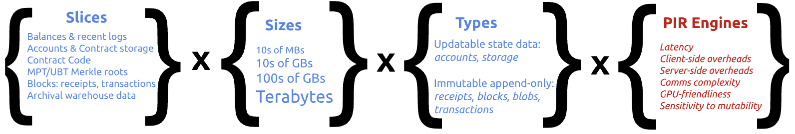 This post proposes a set of slices of Ethereum state data, goes over PIR schemes and the decision tree to pair them with data slices, proposes a design sketch for sharding, and touches on some Ethereum-specific optimizations that may further scale the overall system.
