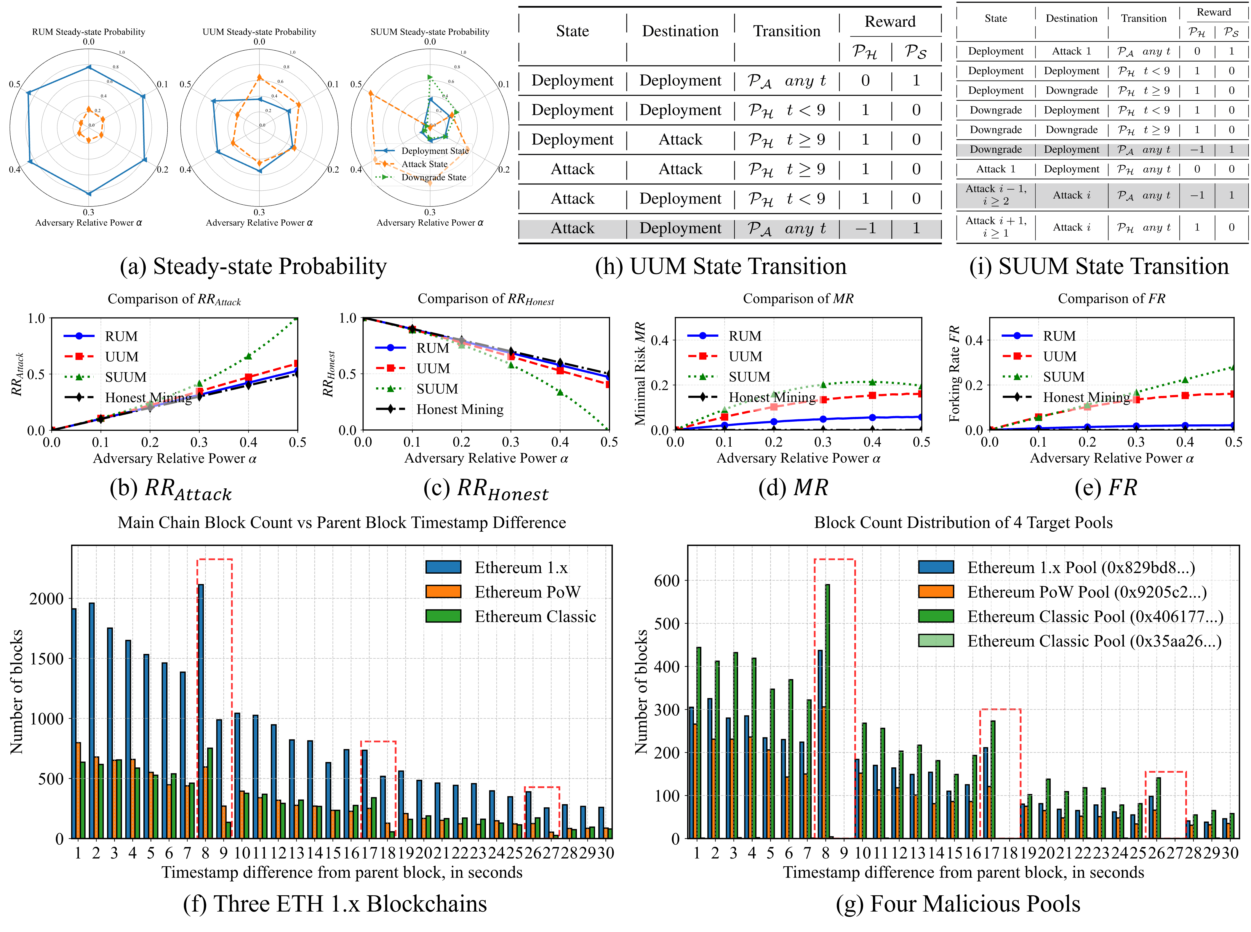 Fig. 2. Results of Our Work. (a) Steady-state Probability. (b) Comparison of Adversary Relative Rewards. (c) Comparison of Honest Participant Relative Rewards. (d) Comparison of Minimal Difficulty Risk. (e) Comparison of Forking Rates. (f) The Distribution of Mainchain Blocks in Ethereum 1.x, Ethereum PoW, and Ethereum Classic. (g) Four Malicious Mining Pools. (h) UUM State Transition. (i) SUUM State Transition.