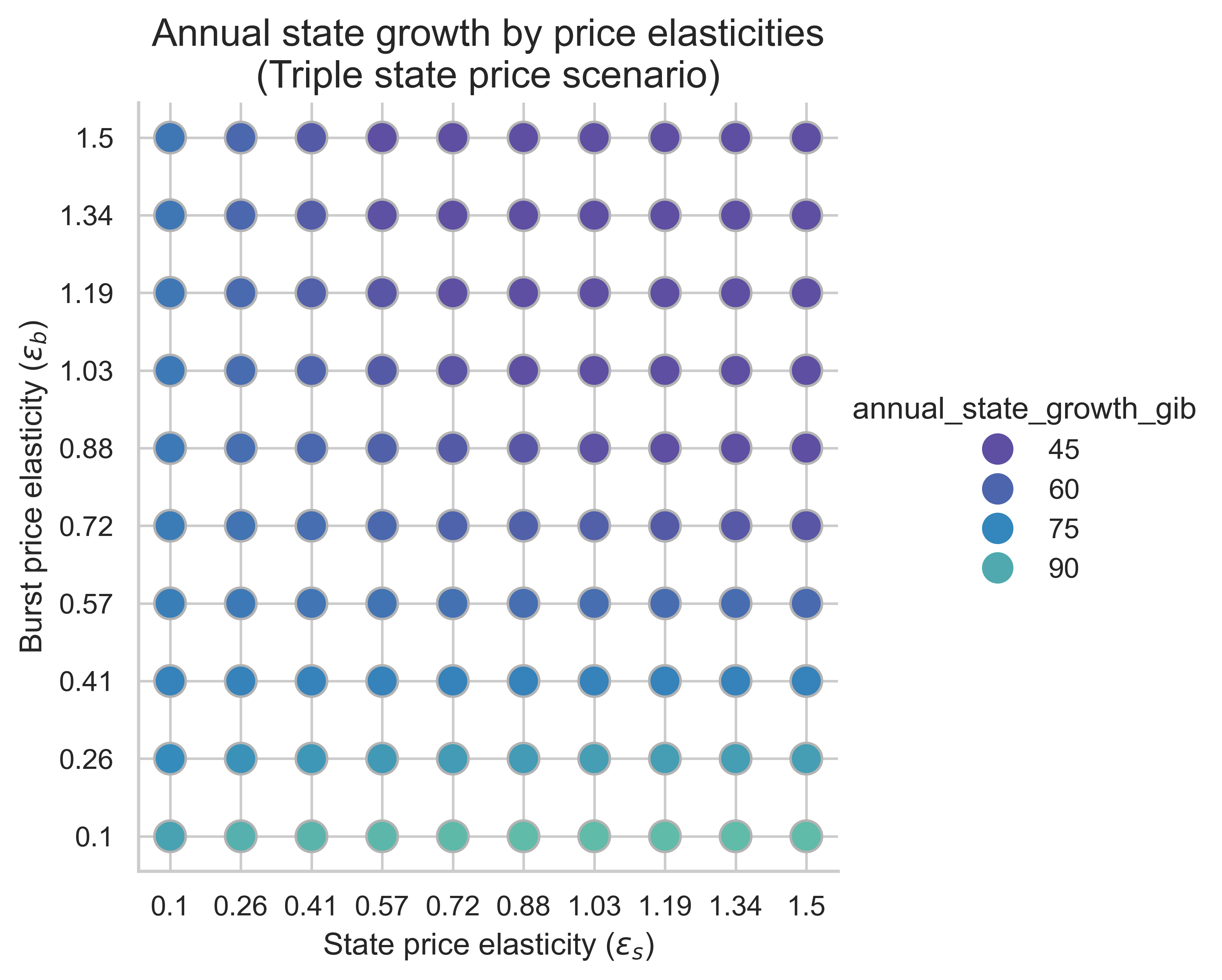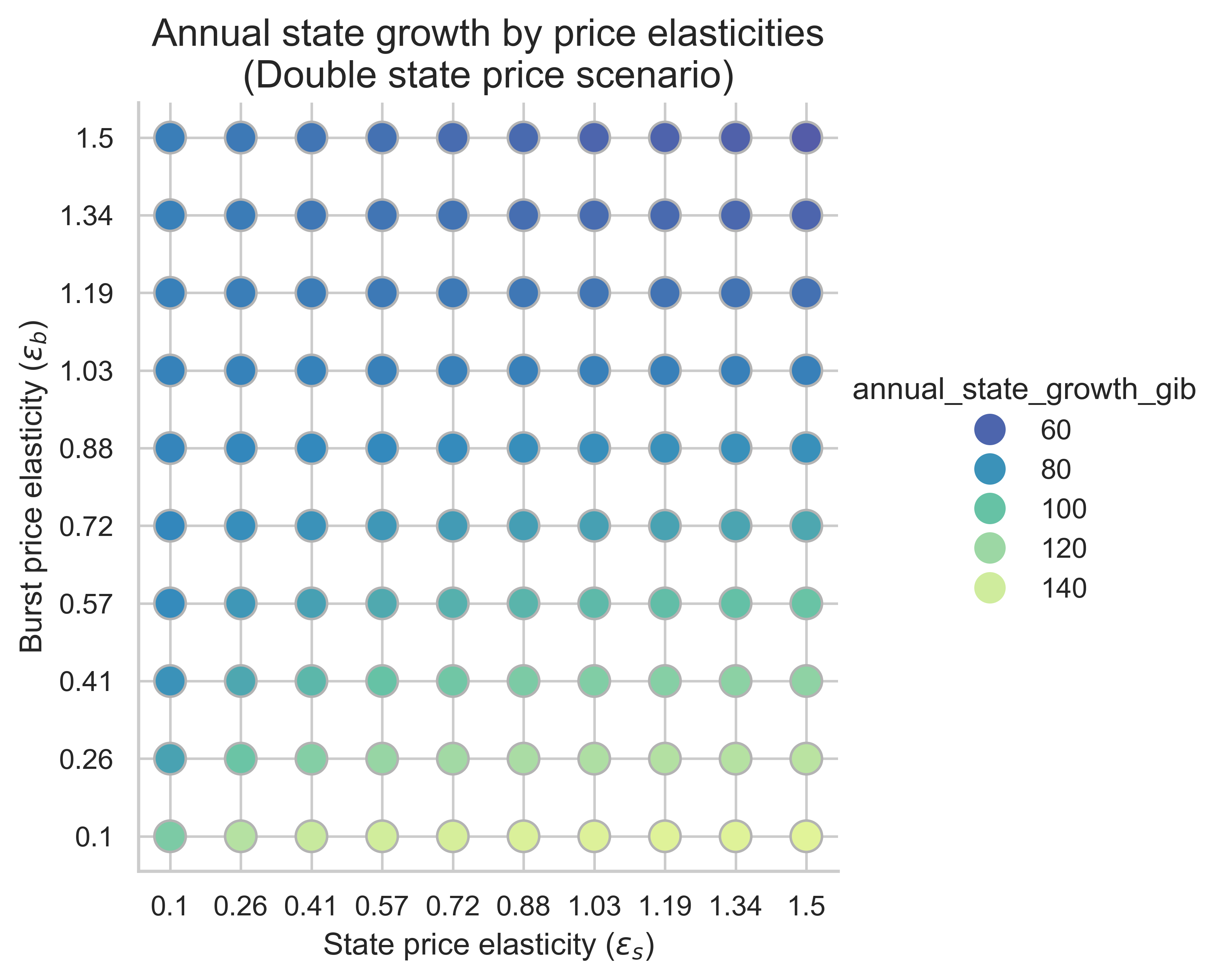 The following plots show the annual state growth for all price elasticity combinations (​\varepsilon_s, \varepsilon_b). Here we assume that the average block is the equilibrium block. This metric is key to understand how effective increasing the cost of state creation operations is at mitigating state growth.