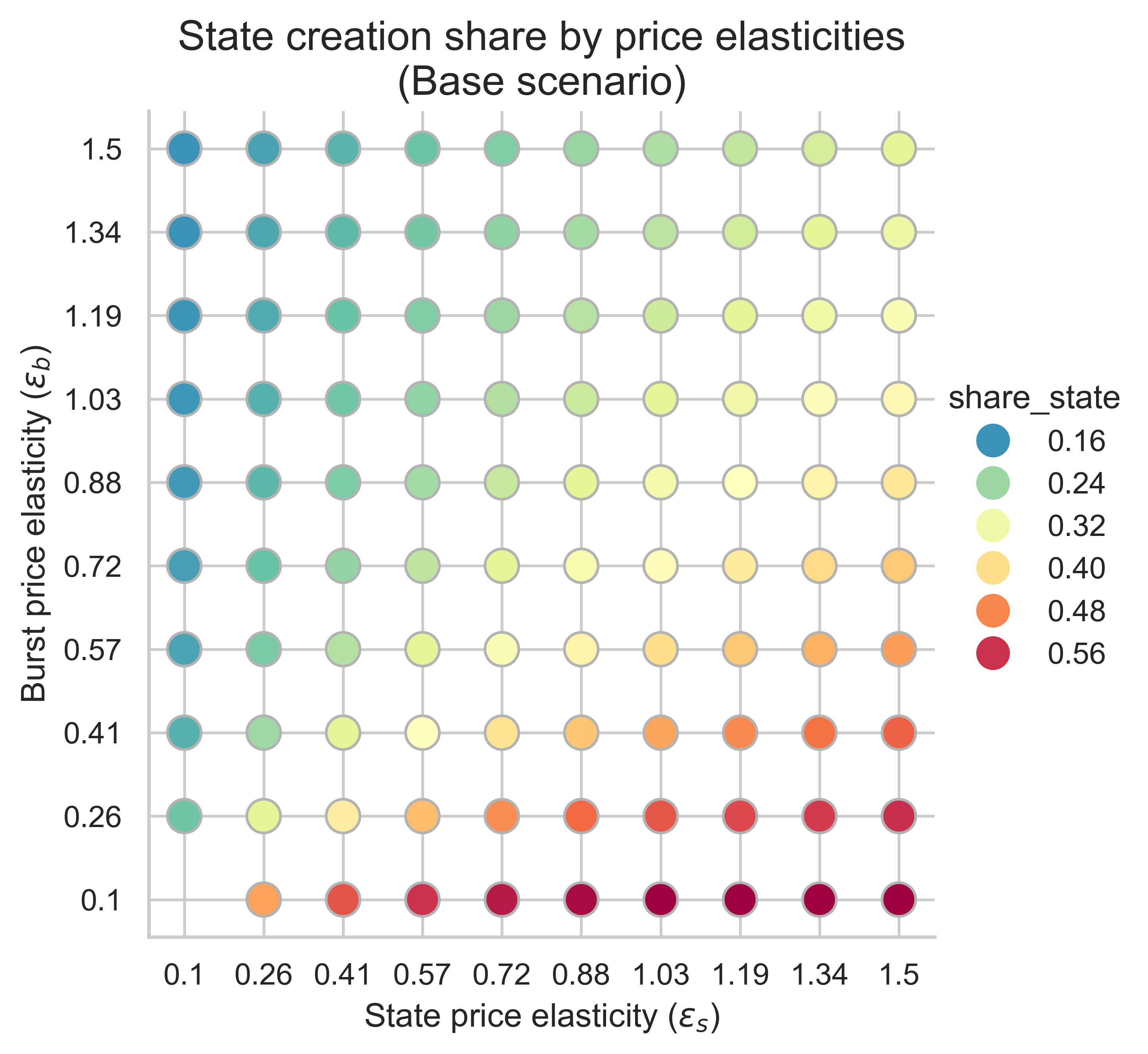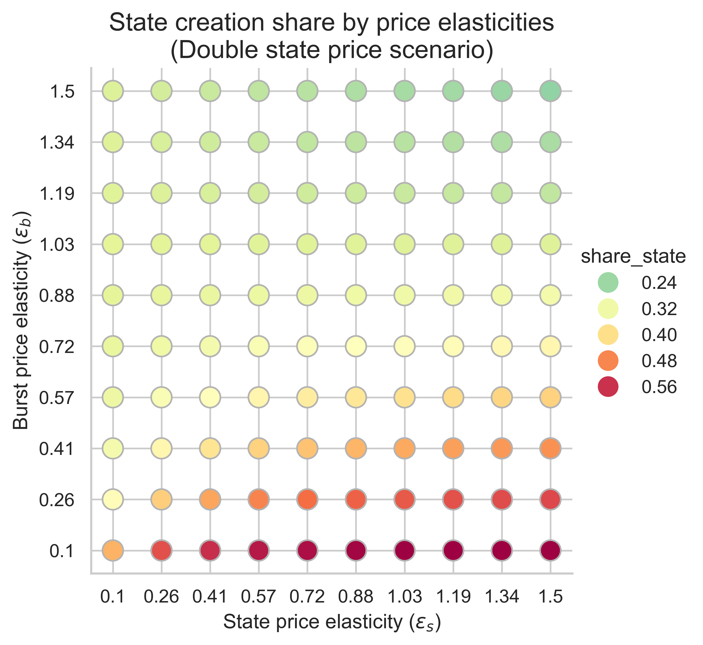 - The cases with the highest share of state creation occur when demand for burst resources has low elasticity (bottom side of the plot). In this case, increasing the cost of state creation has no effect.