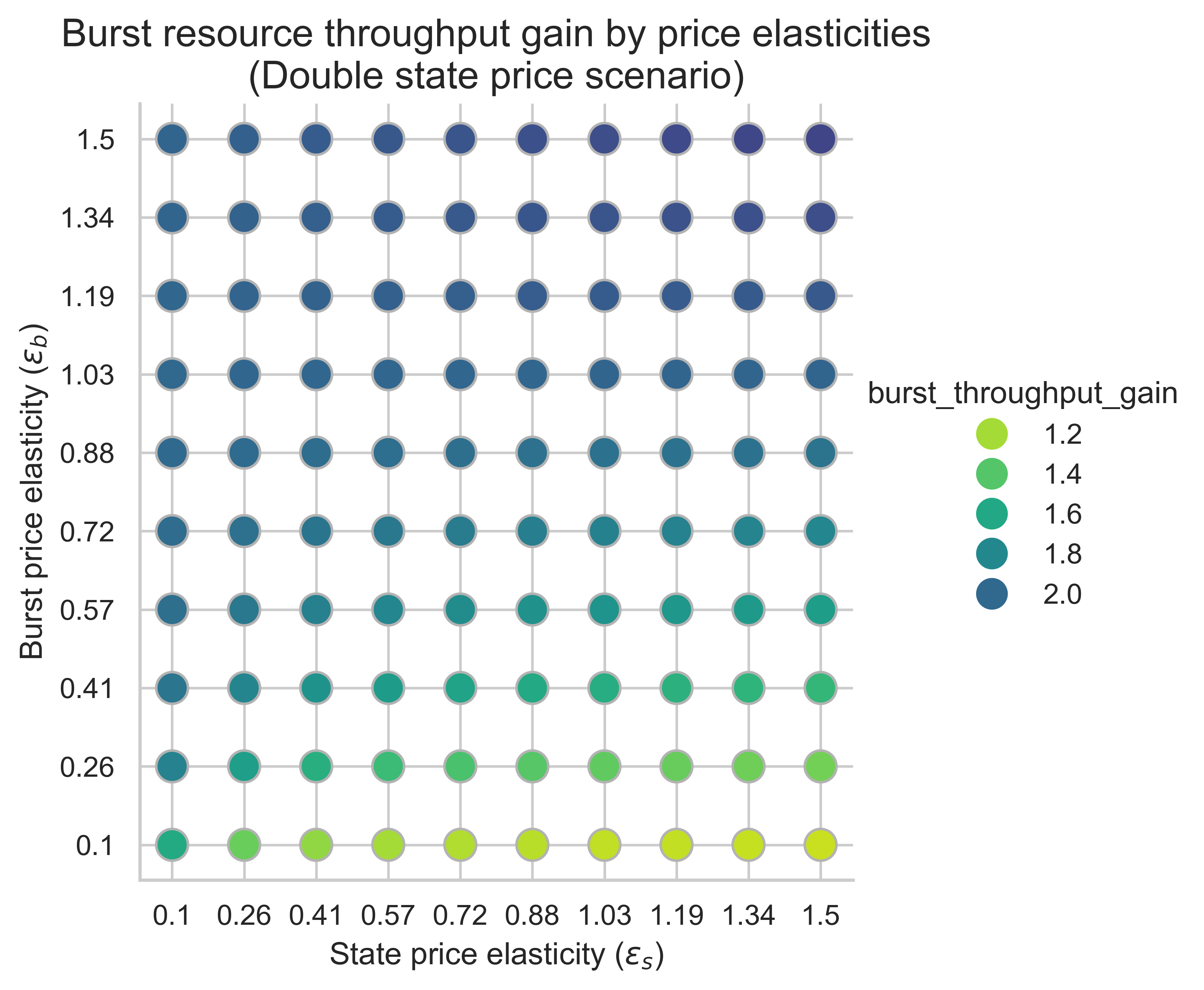 The following plots show the throughput gains on burst resources in the equilibrium block for all price elasticity combinations (​\varepsilon_s, \varepsilon_b). The gain is computed over the 0.7-second baseline throughput.