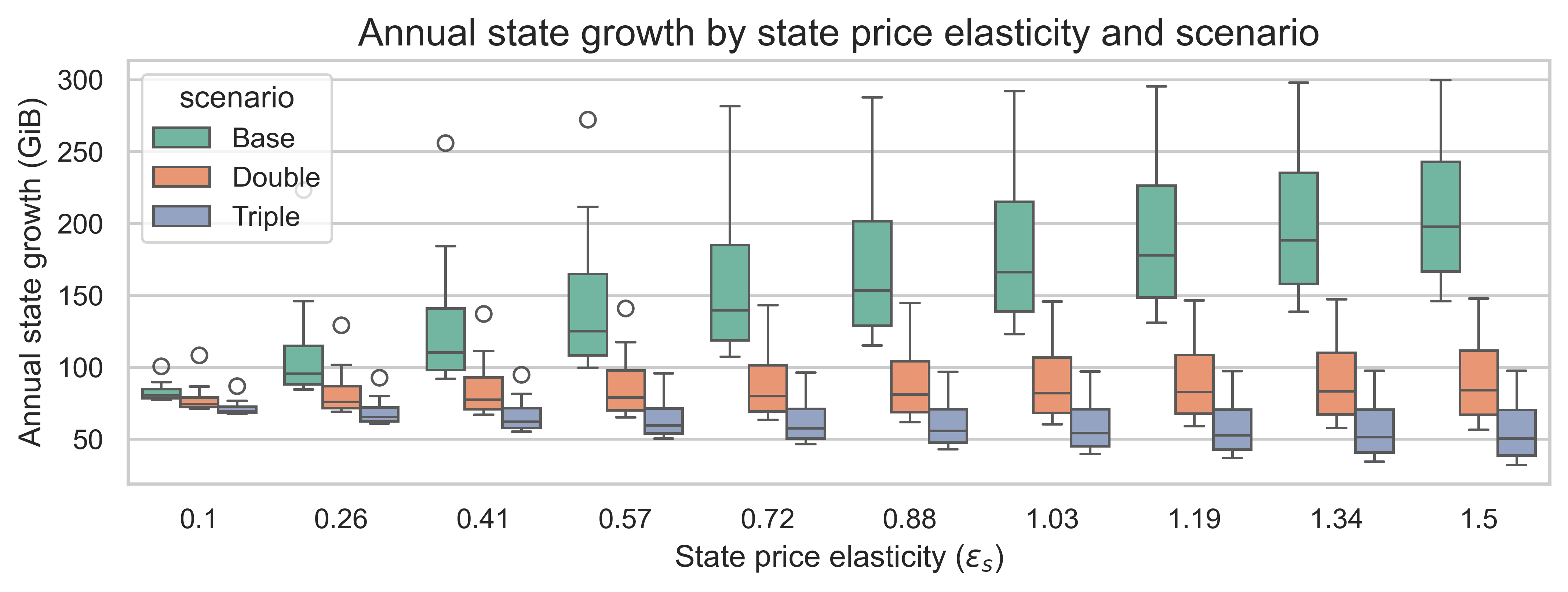 Increasing the gas cost of state creation has another interesting effect. We can observe it by plotting the annual state growth against the state demand elasticity \varepsilon_s for each scenario. The variation on each boxplot is due to the burst demand elasticity \varepsilon_b.
