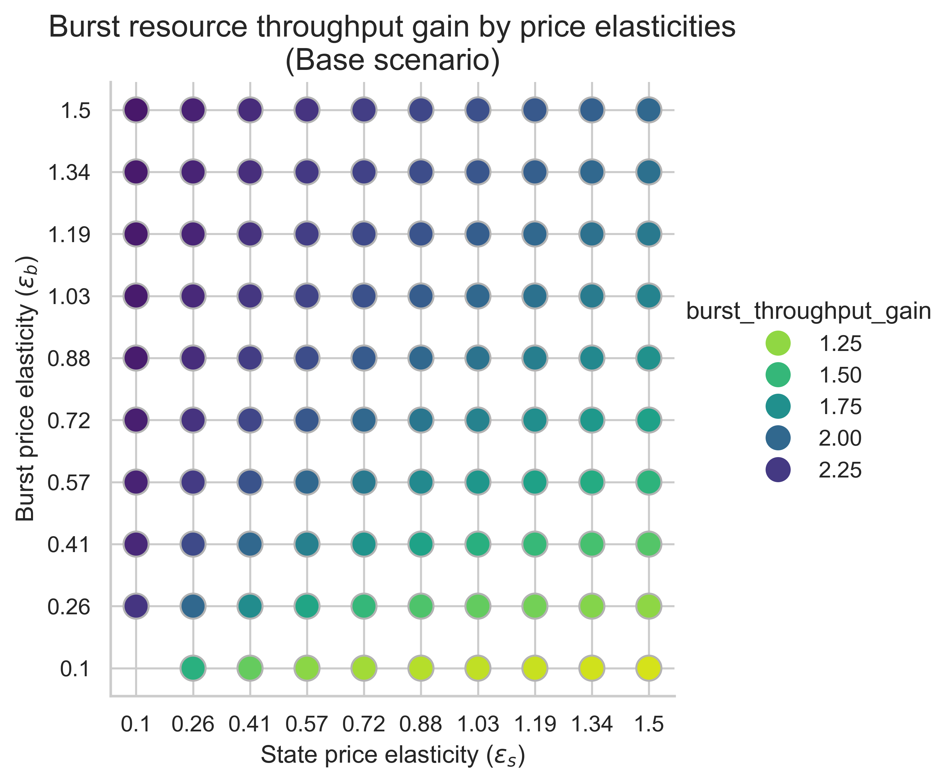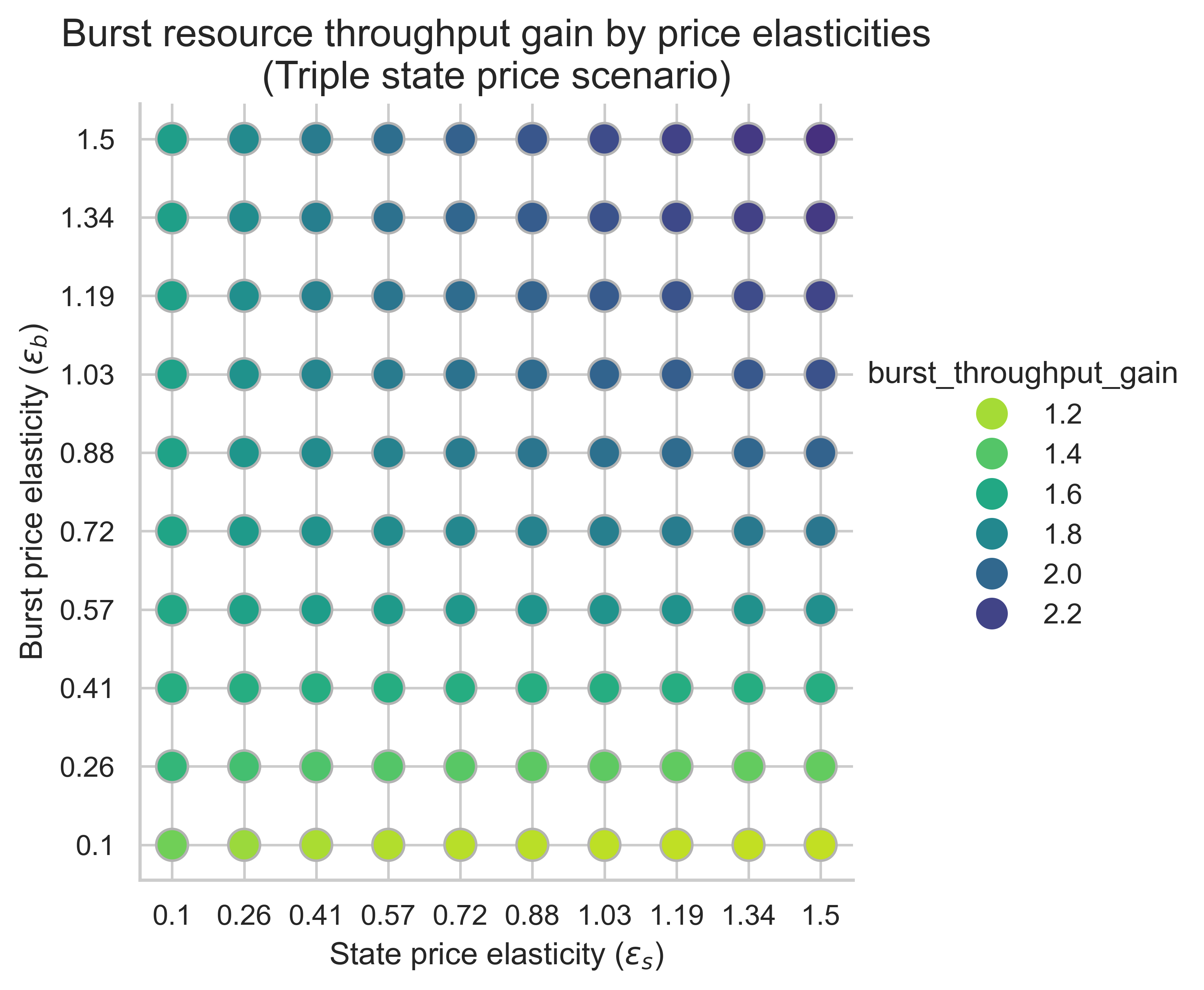 In all three scenarios, the dominant driver of burst-throughput gains is the burst-side price elasticity, \varepsilon_b. As \varepsilon_b rises, we see an increasing gain over the 0.7-s baseline: