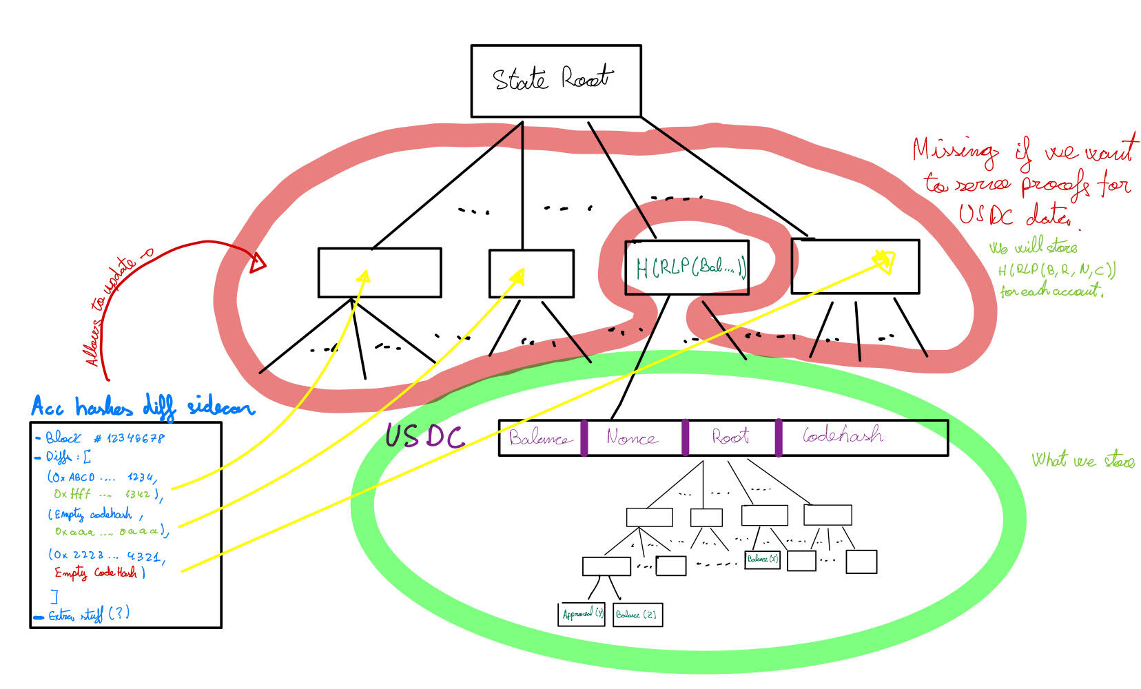 accountHashforUSDC(which embeds itsstorageRoot) to connect that proof to the account layer. - Re-hash upward to the verified global state root derived from sidecar updates.