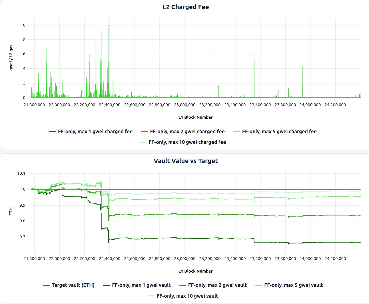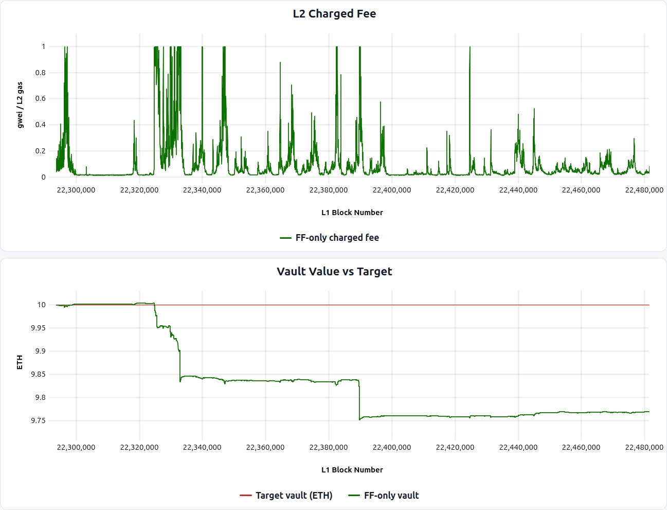 This means the vault’s view of L1 costs is inherently delayed. It can only reflect costs that have been recorded on L1 and imported into L2. This delay is captured by the delay parameter in the controller formulas above.
