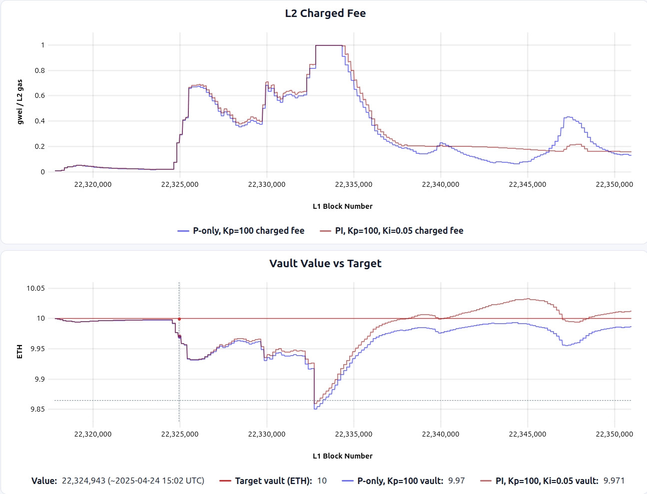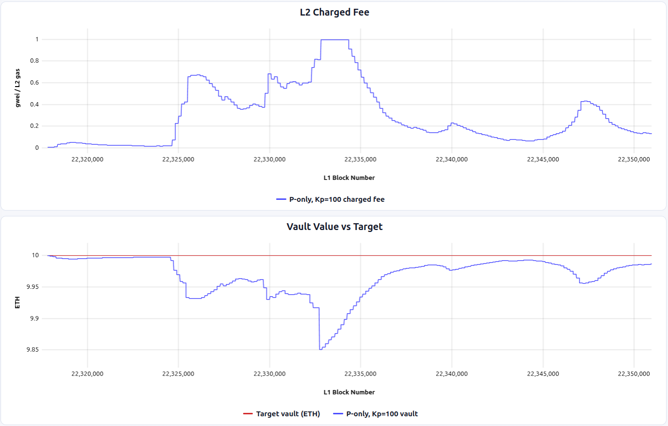 - The integral term can create overshoot: after conditions normalize (e.g., after an L1 spike passes), the accumulated integral can keep the fee elevated, temporarily pushing the vault above target, which increases fee volatility from the users’ perspective.