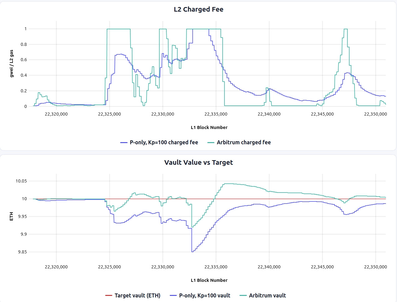 - Arbitrum-style achieves stronger vault health at the cost of higher fee volatility than P-only, especially around sharp stress events like the L1 cost spike, but it has more jagged fee updates and higher complexity.
