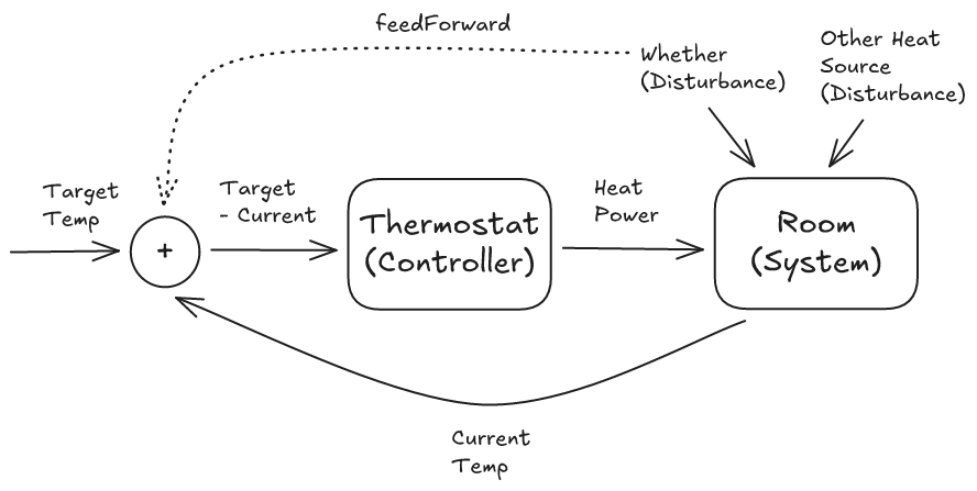 In contrast, a feedforward term reacts to the cause of a disturbance directly, before the effect propagates through the system. For the thermostat: