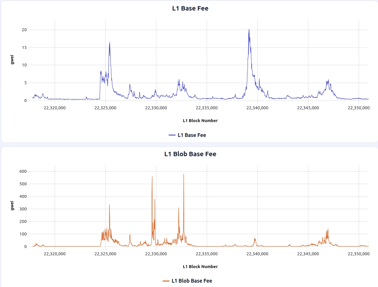 This window includes a notable blob fee spike around L1 block 22389679, which can be useful to zoom in on when comparing how different fee mechanisms react to spikes: