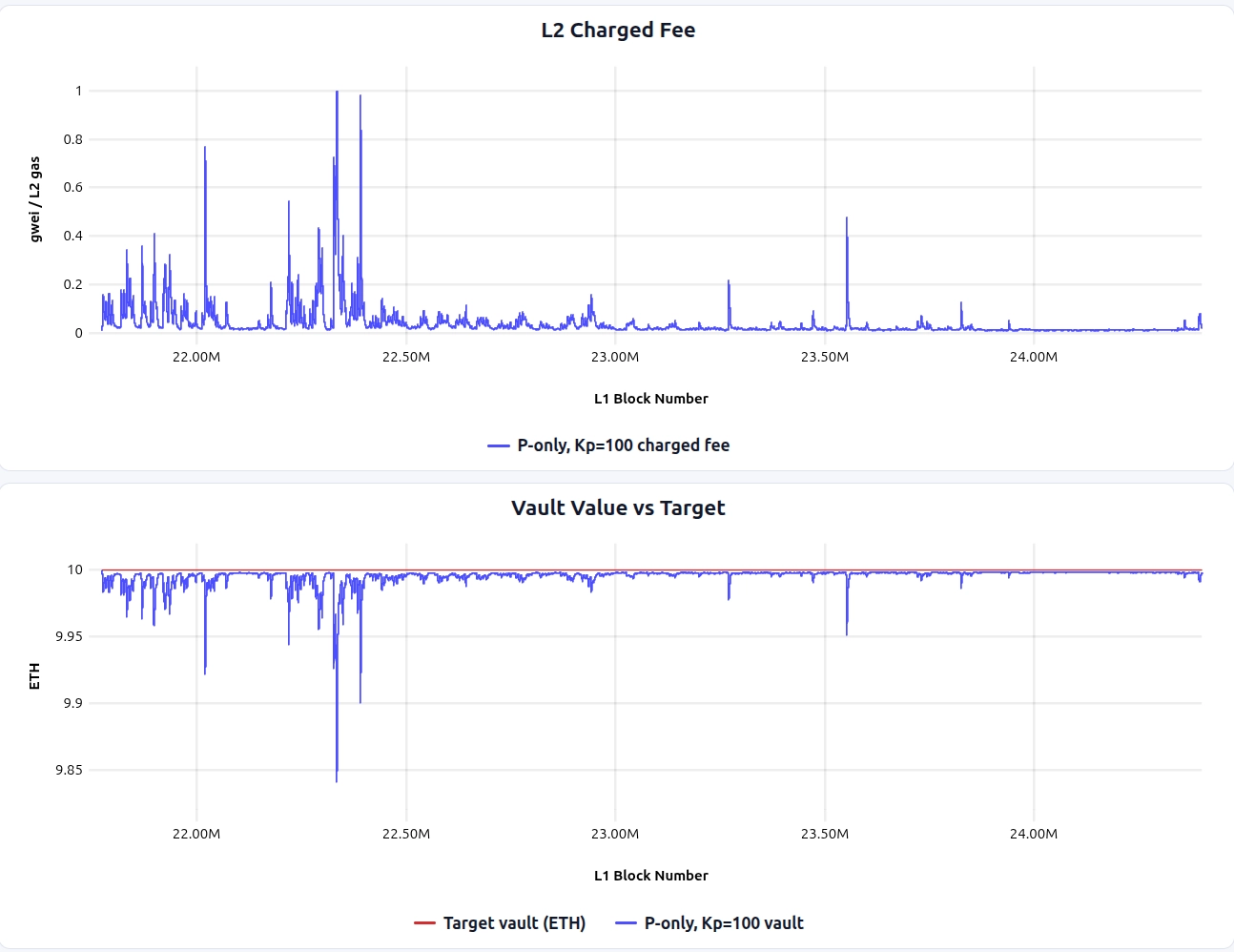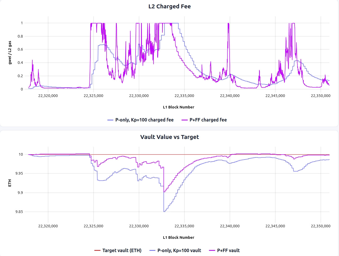 - Compared with FF-only, the P-controller delivers low fee volatility because it responds to accumulated vault error instead of passing each L1 cost spike straight through.