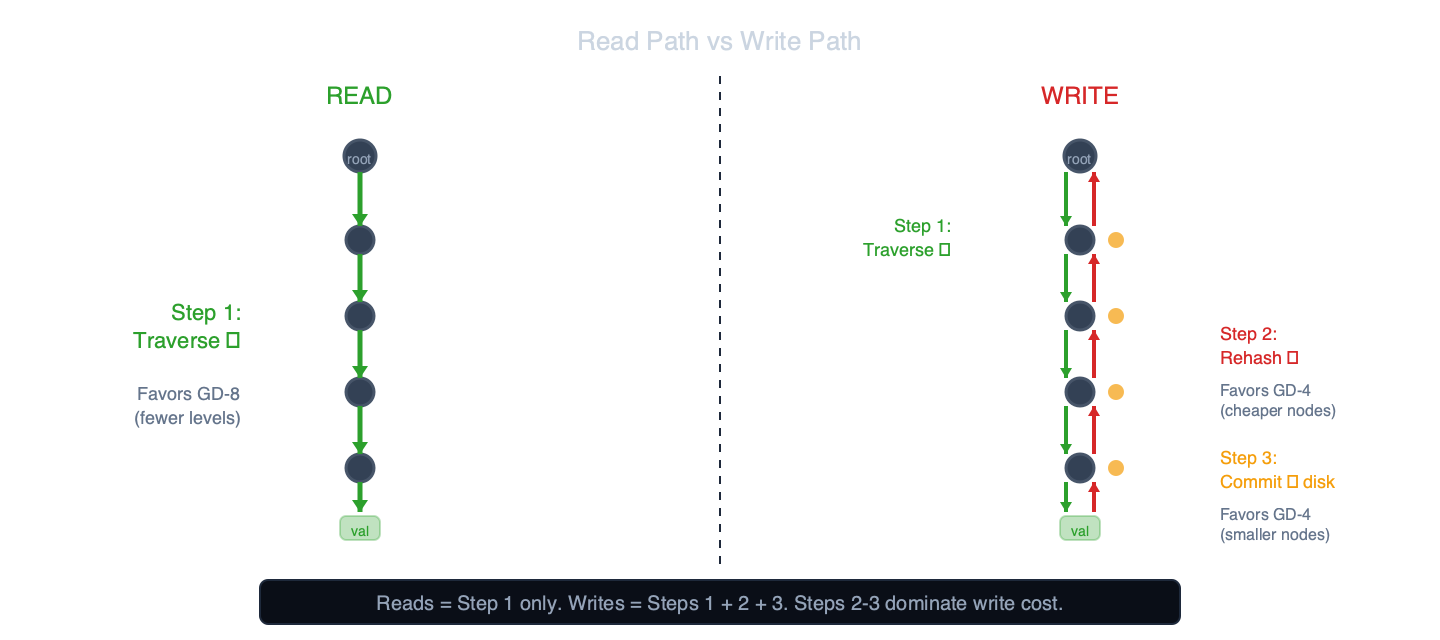 - Pebble block boundary: GD-6 nodes (~2 KB) fit within a single 4 KB Pebble block. GD-7 nodes (~4 KB) saturate the block – with key overhead, they likely span two blocks, potentially doubling I/O per node fetch. This partly explains GD-7’s read reversal: despite 14% fewer path nodes than GD-6 (37 vs 43), GD-7 reads ~148 KB total per lookup (37 × 4 KB) vs GD-6’s ~86 KB (43 × 2 KB).